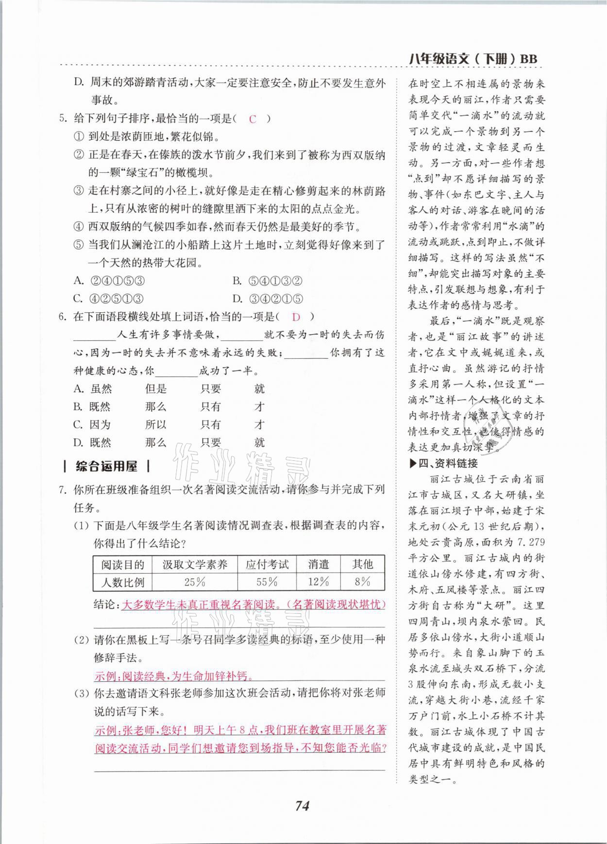 注:目前有些书本章节名称可能整理的还不是很完善,但都是按照顺序排列的,请同学们按照顺序仔细查找。练习册 2021年本土学练八年级语文下册部编版云南专版 答案主要是用来给同学们做完题方便对答案用的,请勿直接抄袭。