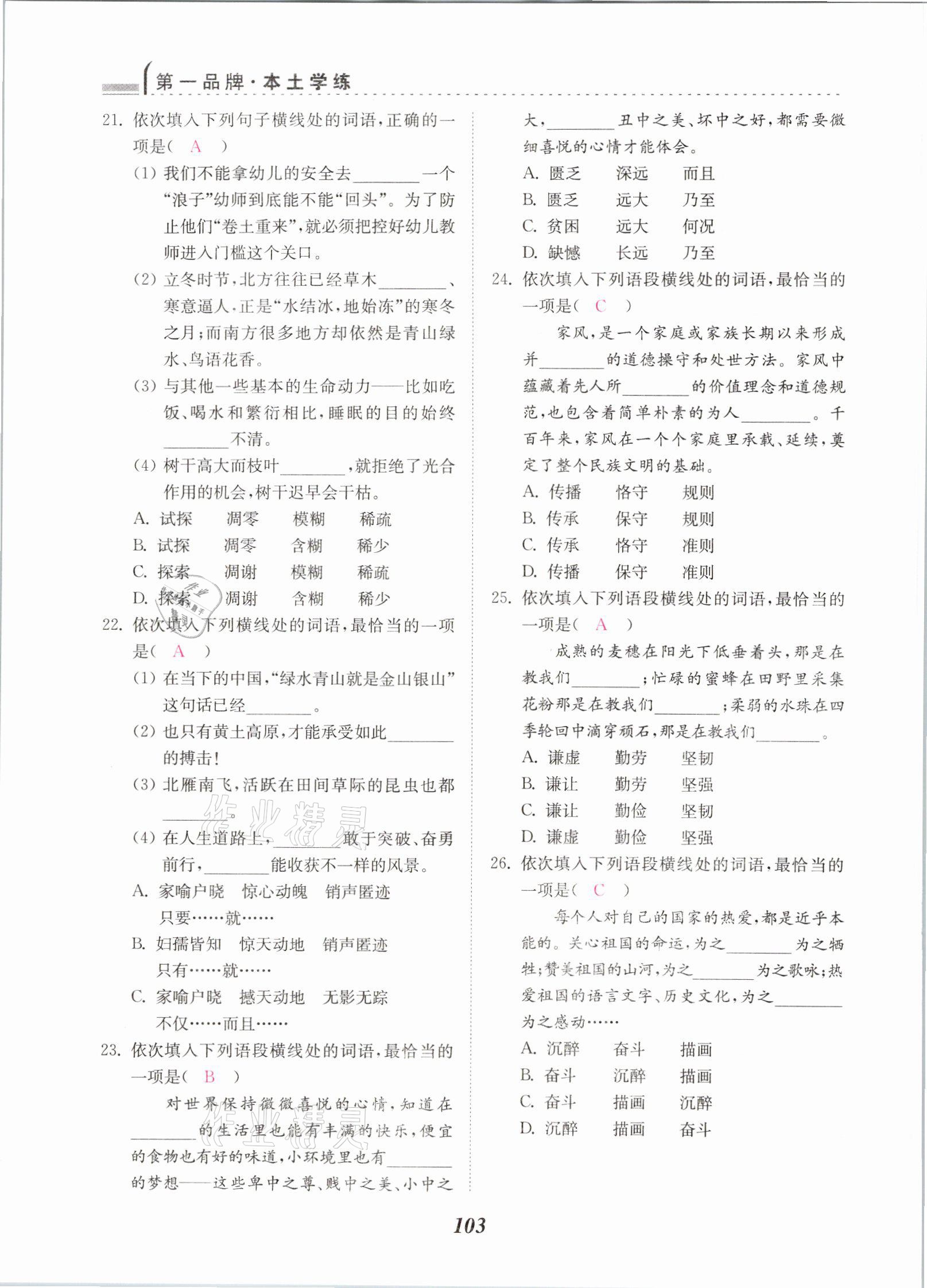 注:目前有些书本章节名称可能整理的还不是很完善,但都是按照顺序排列的,请同学们按照顺序仔细查找。练习册 2021年本土学练八年级语文下册部编版云南专版 答案主要是用来给同学们做完题方便对答案用的,请勿直接抄袭。