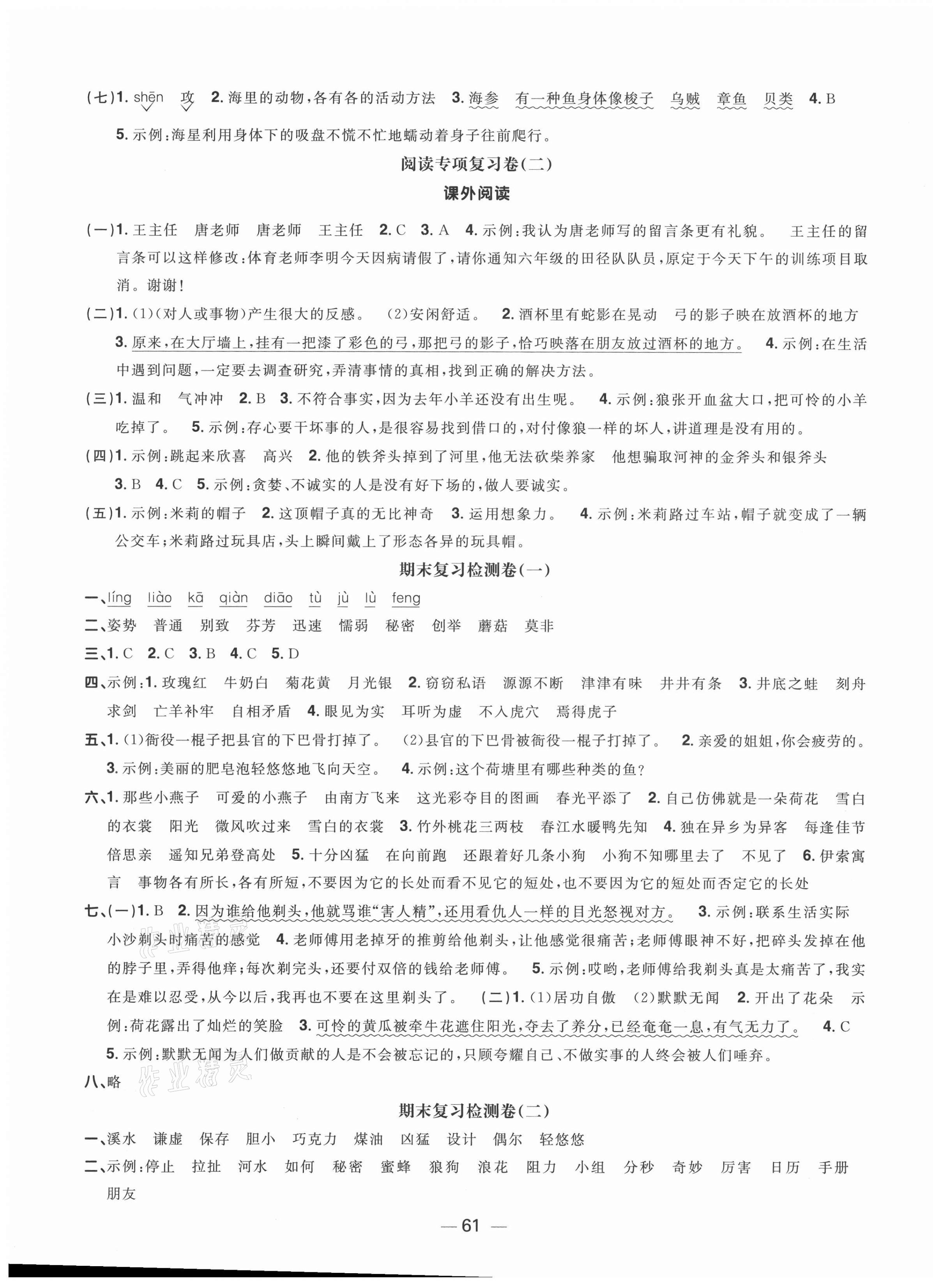 注:目前有些书本章节名称可能整理的还不是很完善,但都是按照顺序排列的,请同学们按照顺序仔细查找。练习册 2021年阳光同学期末复习15天冲刺100分三年级语文下册人教版 答案主要是用来给同学们做完题方便对答案用的,请勿直接抄袭。