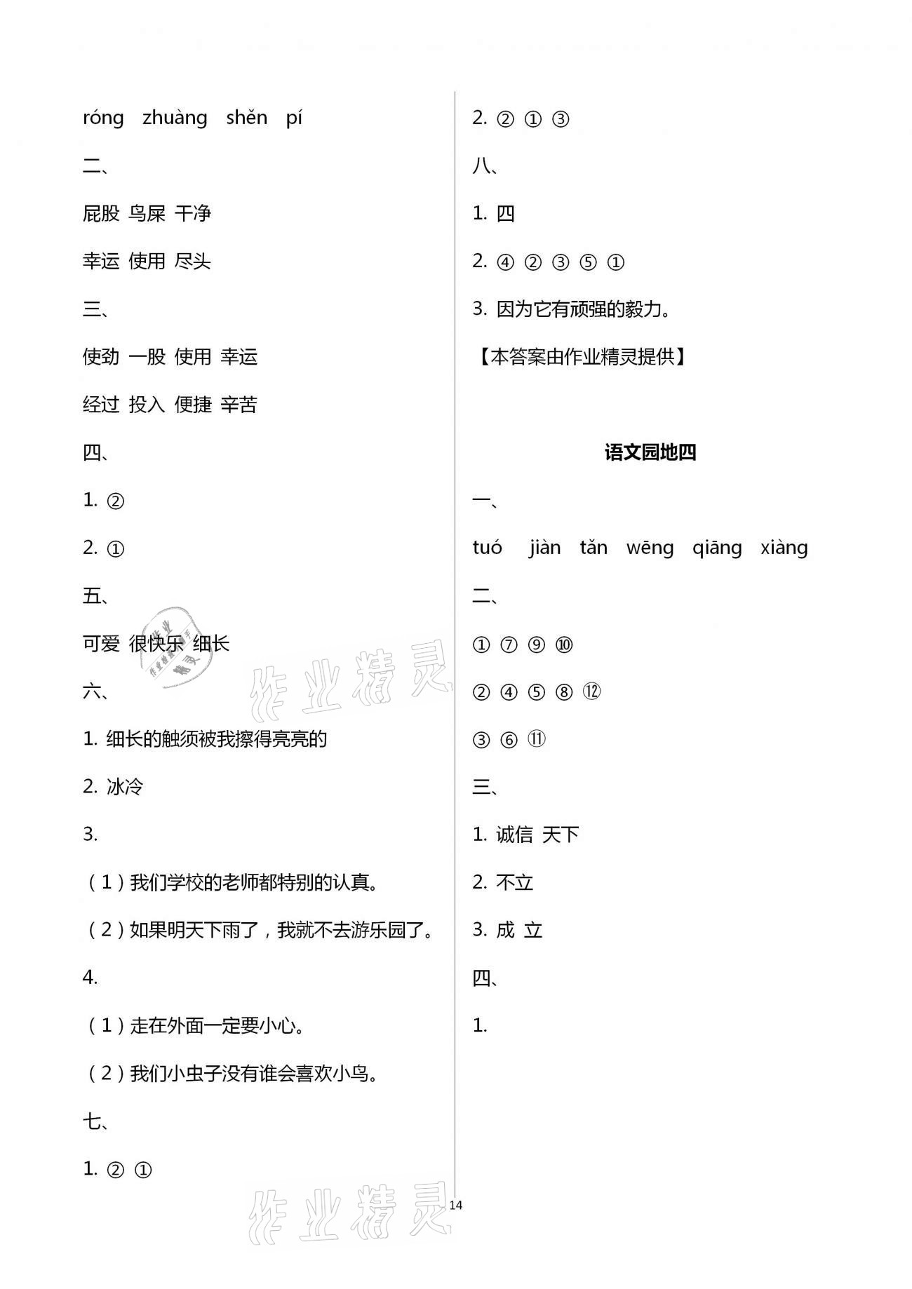 注:目前有些书本章节名称可能整理的还不是很完善,但都是按照顺序排列的,请同学们按照顺序仔细查找。练习册 2021年新课程学习指导二年级语文下册人教版南方出版社 答案主要是用来给同学们做完题方便对答案用的,请勿直接抄袭。