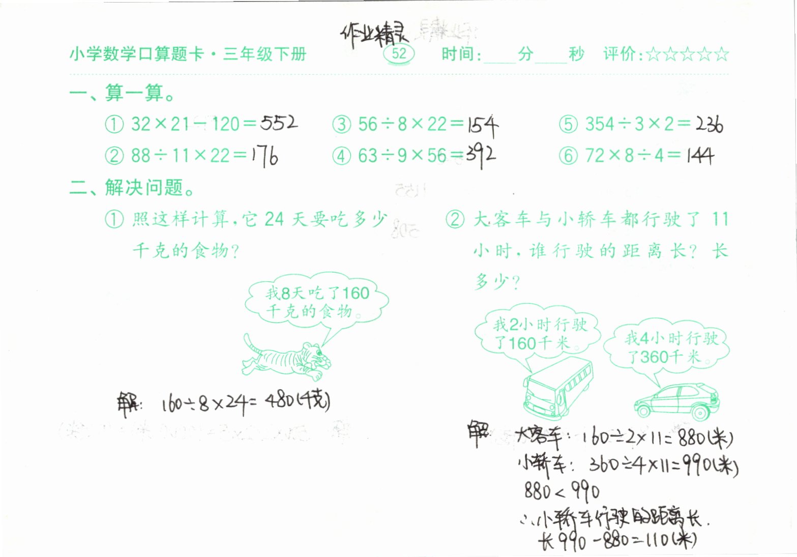 2021年口算题卡三年级下册人教版齐鲁书社