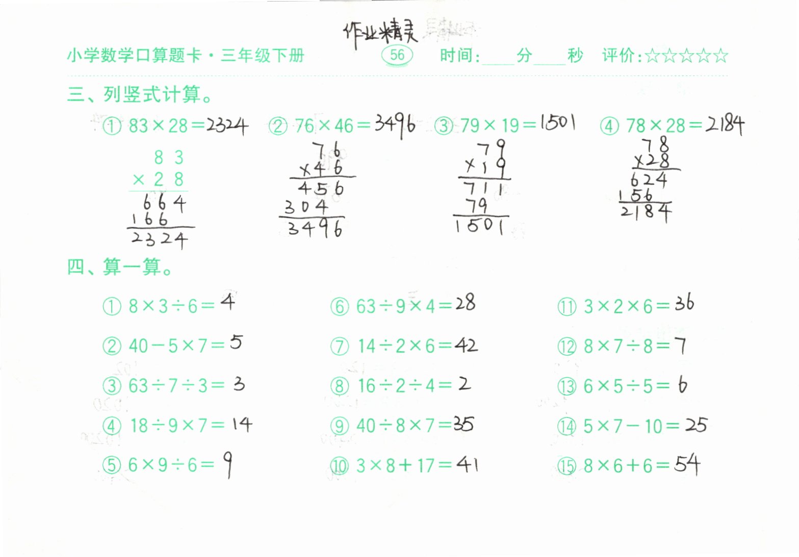 2021年口算题卡三年级下册人教版齐鲁书社