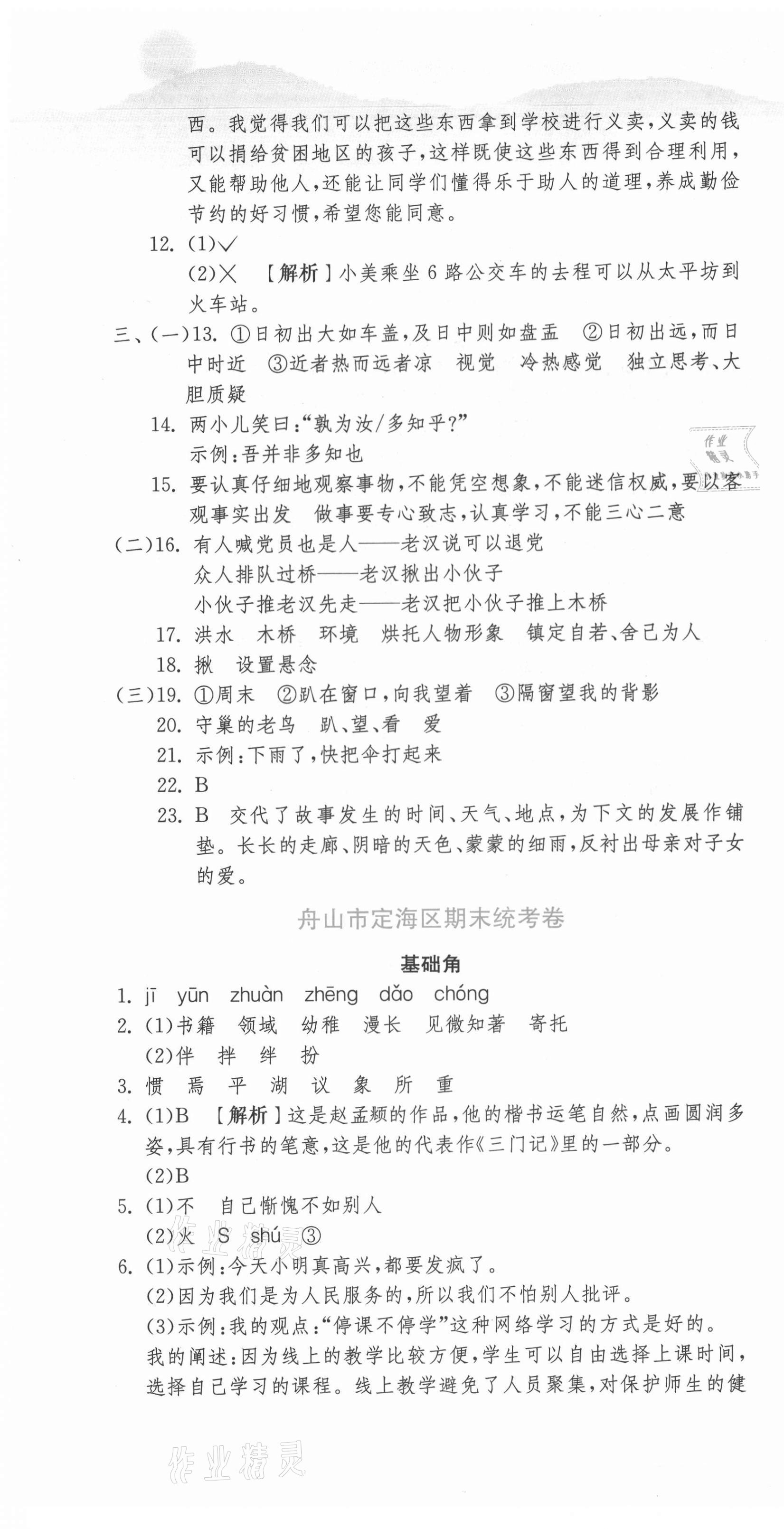 注:目前有些书本章节名称可能整理的还不是很完善,但都是按照顺序排列的,请同学们按照顺序仔细查找。练习册 2021年期末闯关各地期末试卷精选六年级语文下册人教版浙江专版 答案主要是用来给同学们做完题方便对答案用的,请勿直接抄袭。