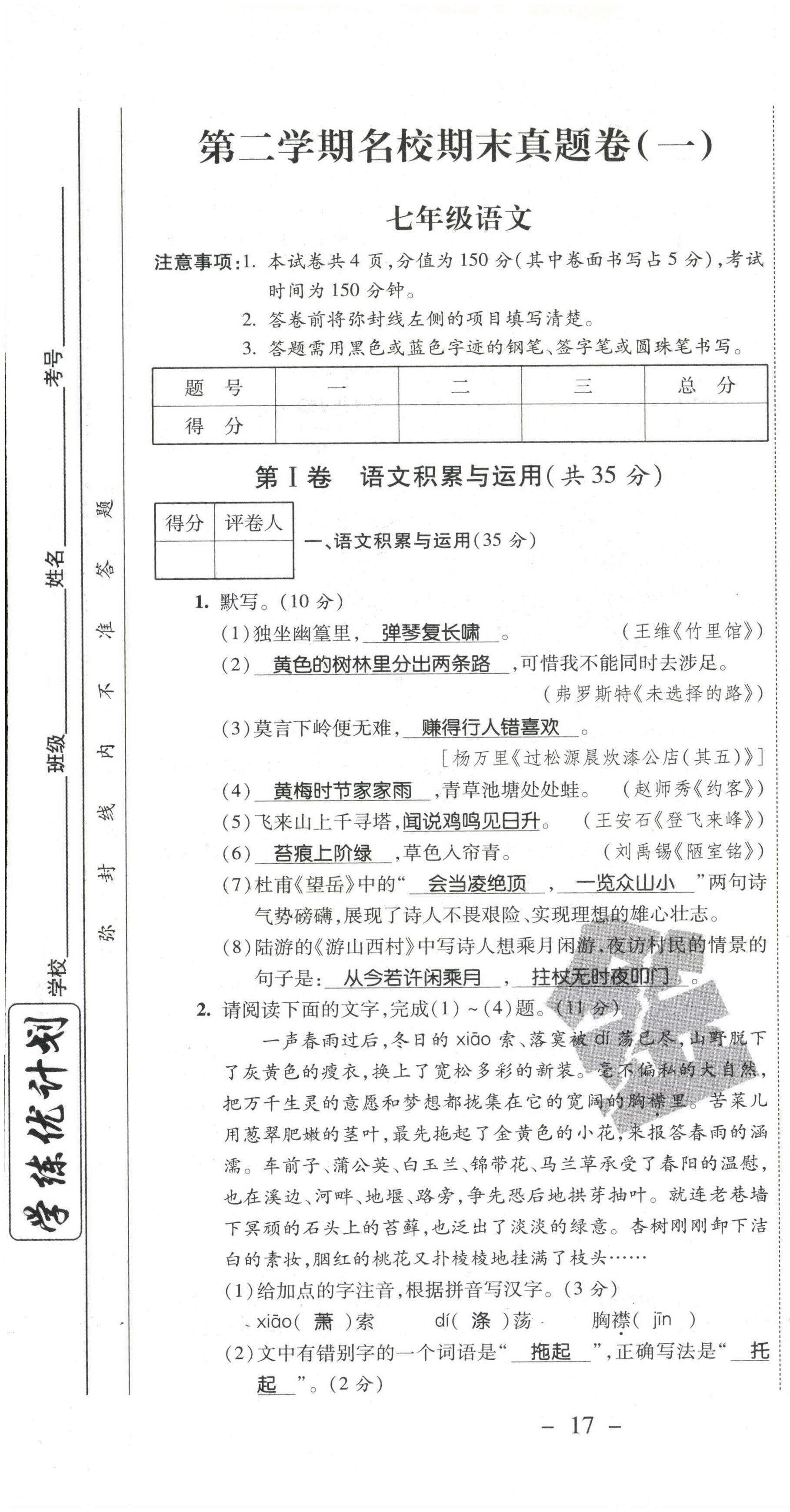 2021年期末必刷题学练优计划七年级语文下册人教版