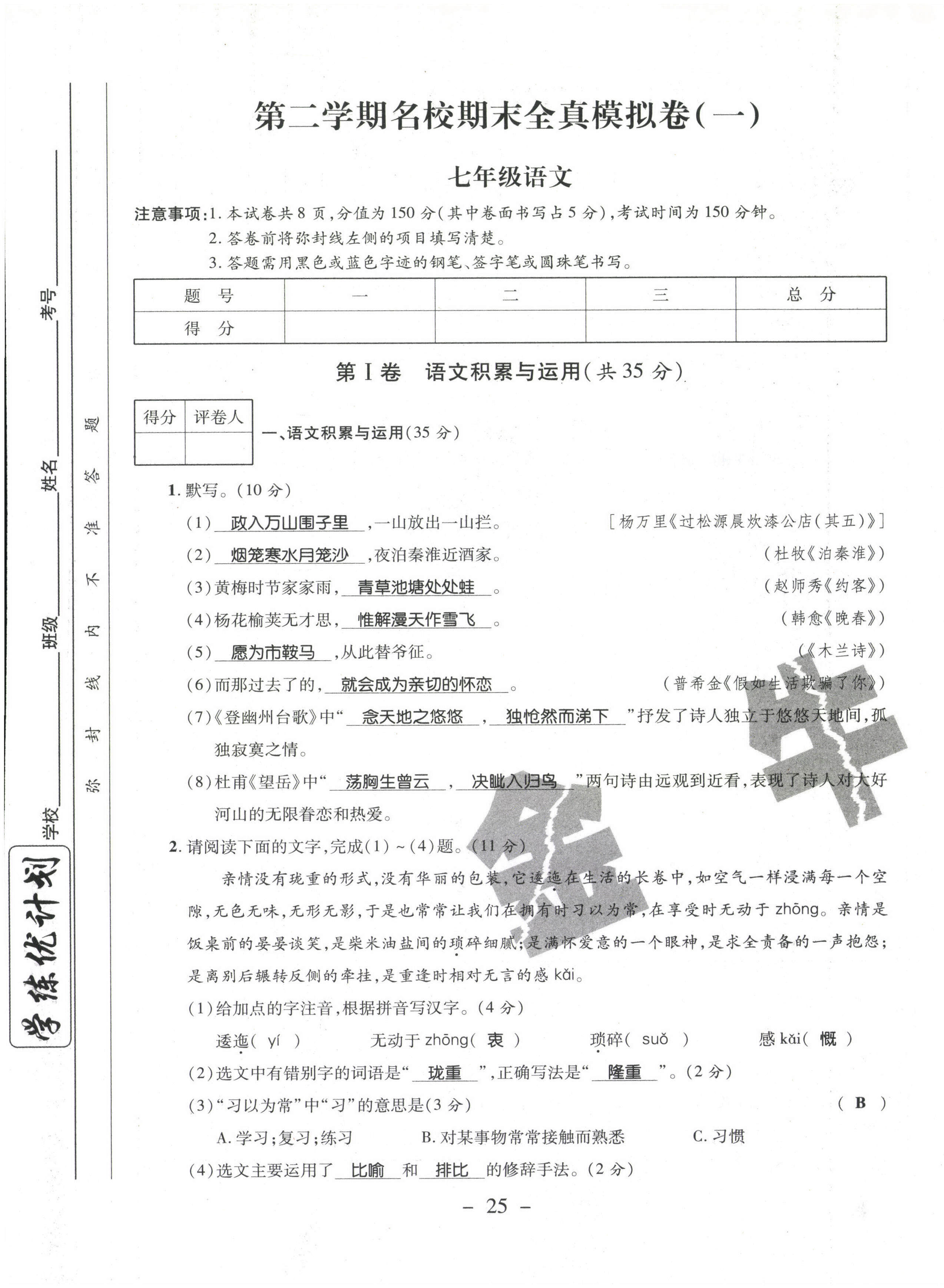 2021年期末必刷题学练优计划七年级语文下册人教版
