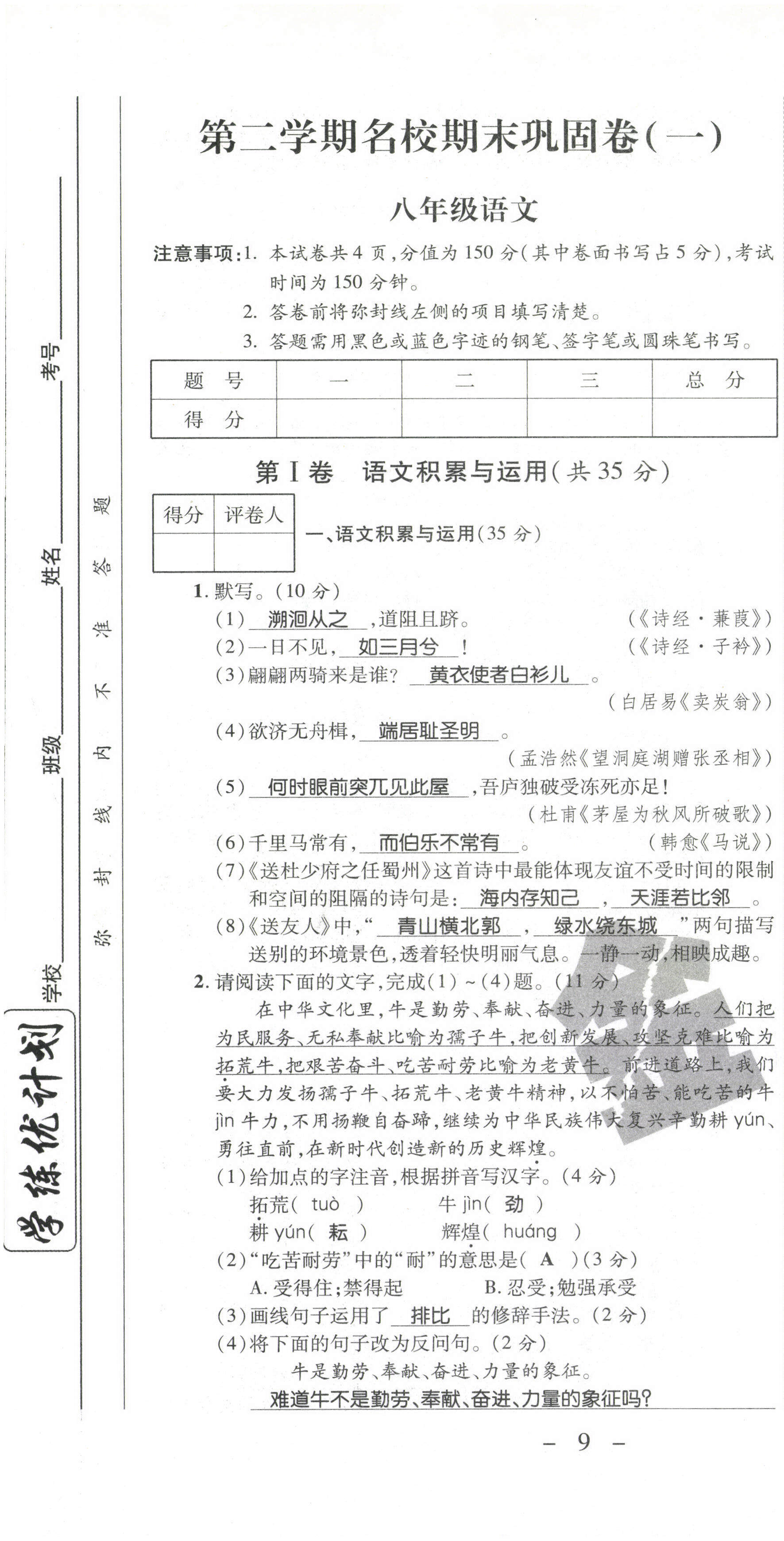 2021年期末必刷题学练优计划八年级语文下册人教版