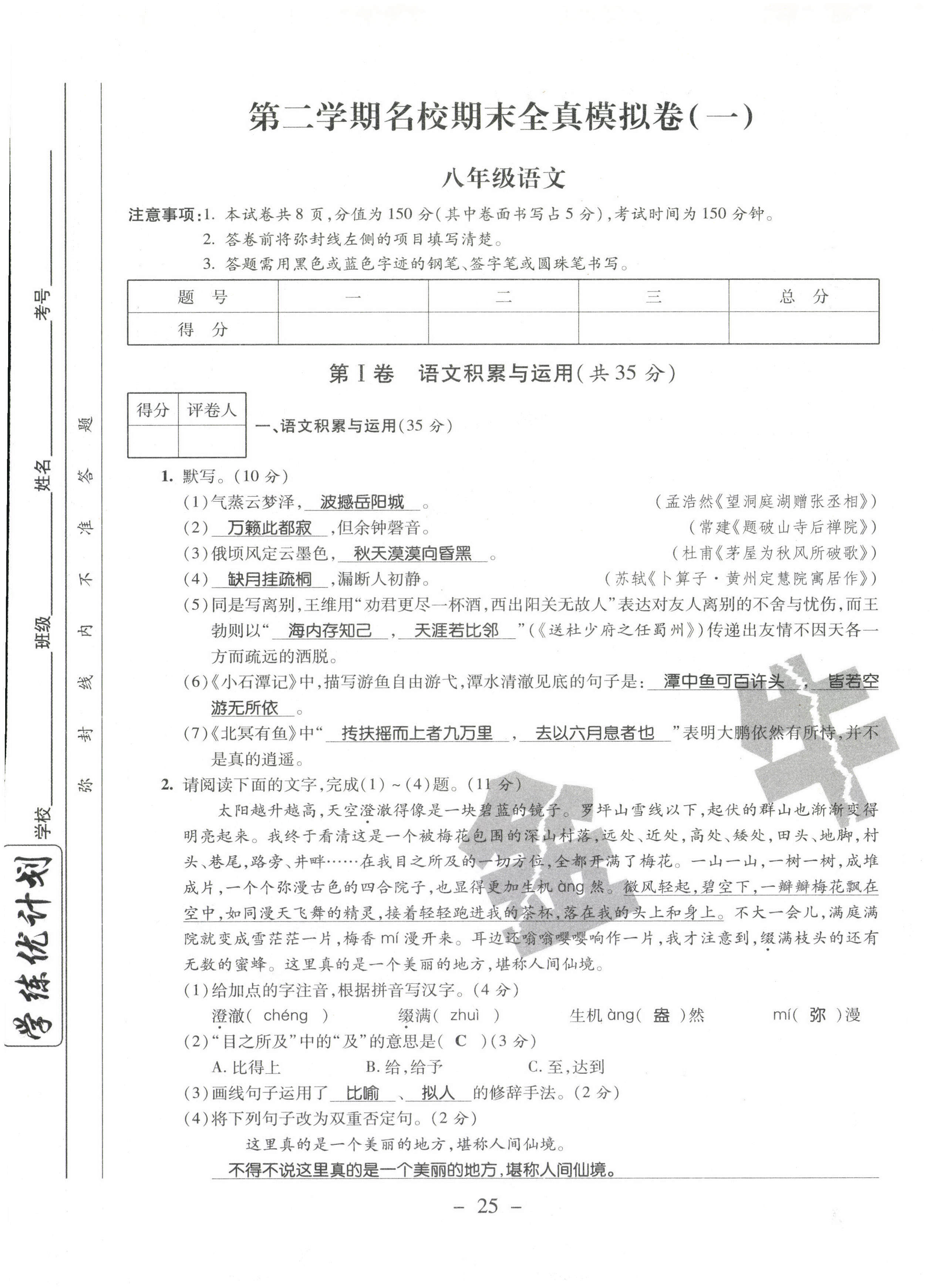 2021年期末必刷题学练优计划八年级语文下册人教版