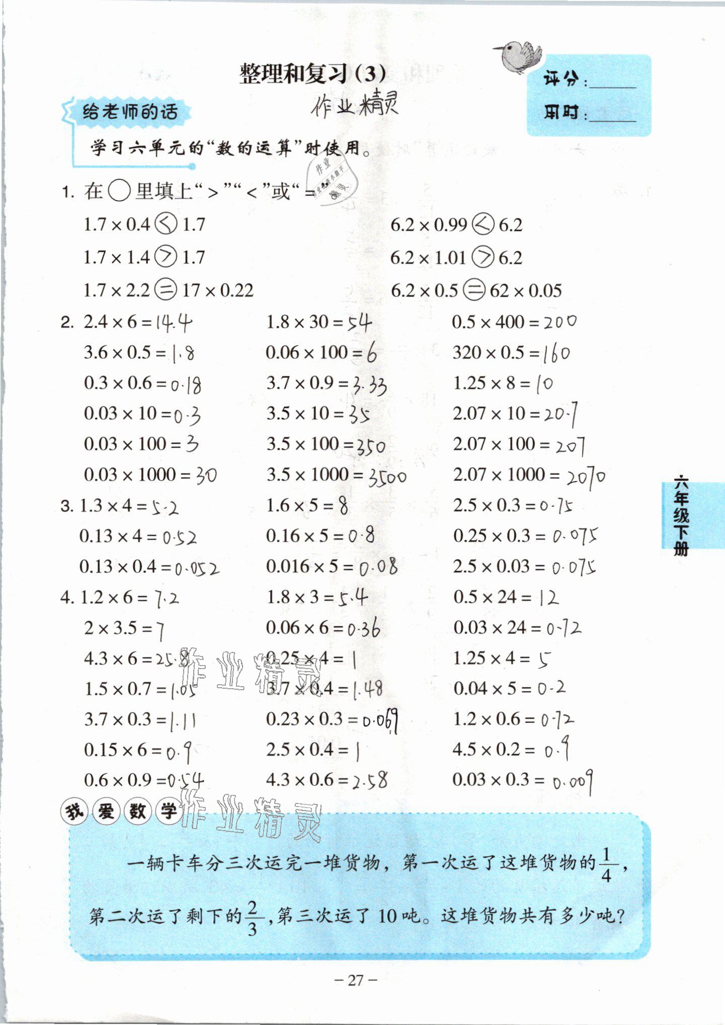 2021年小学数学口算练习册六年级下册人教版人民教育出版社