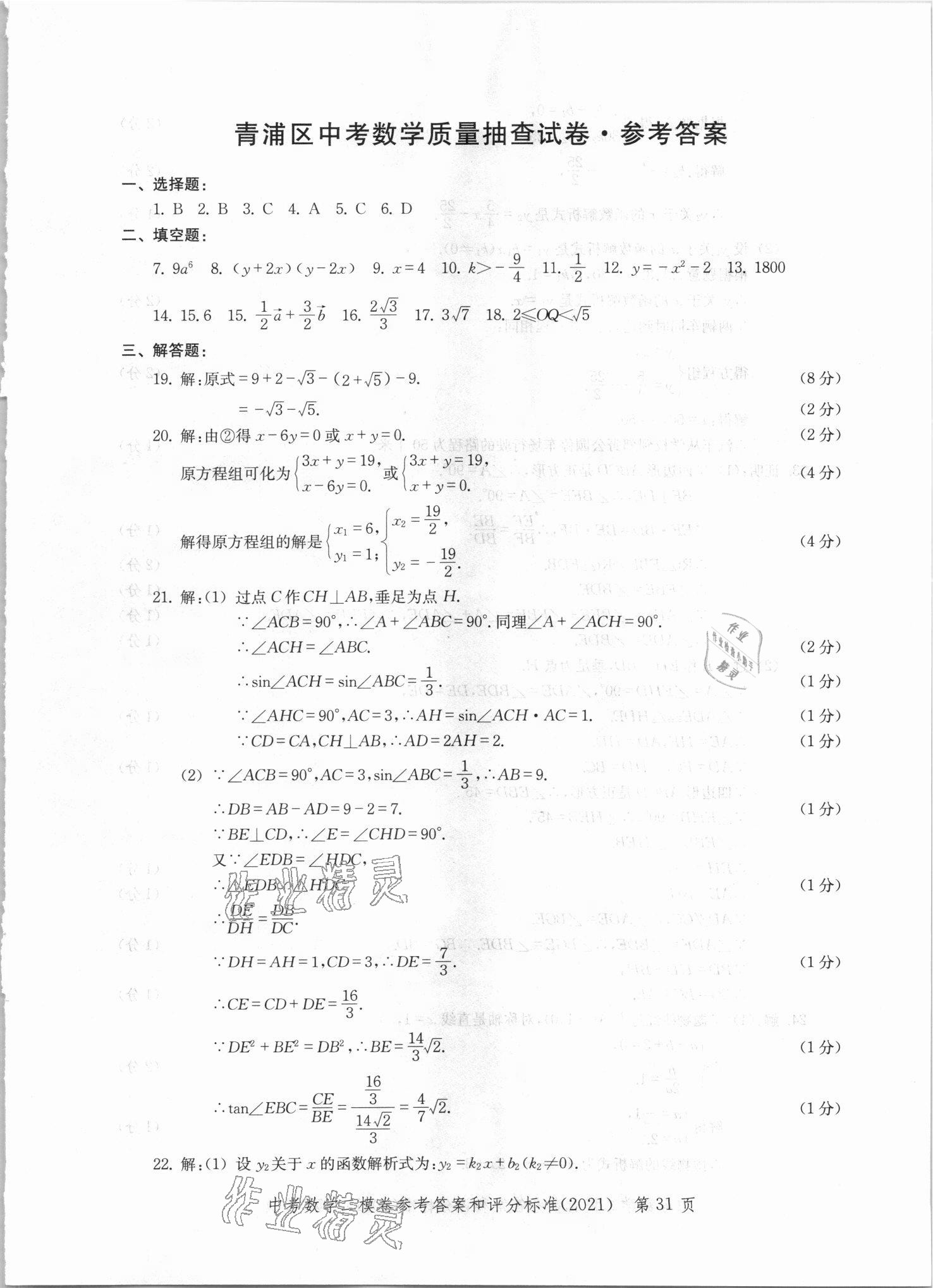 《2021年走向成功上海市各区中考考前质量抽查试卷精编数学》