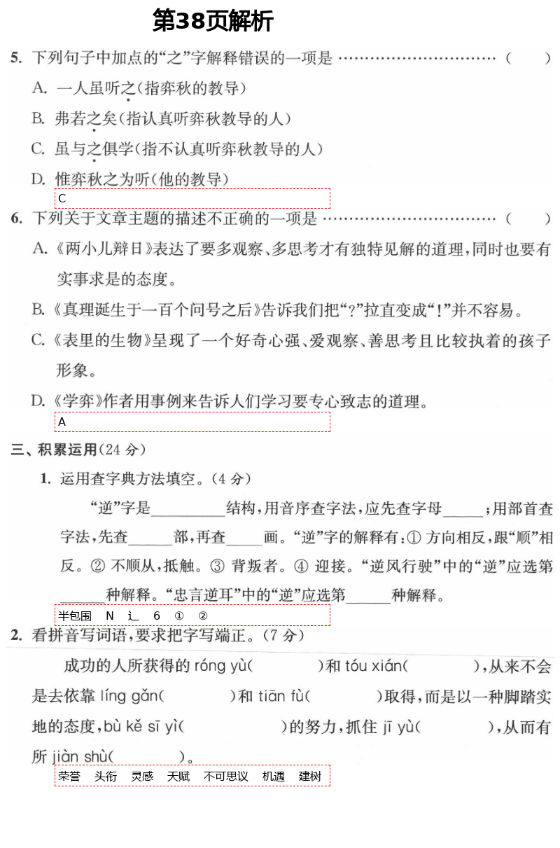 注:目前有些书本章节名称可能整理的还不是很完善,但都是按照顺序排列的,请同学们按照顺序仔细查找。练习册 2021年小学生综合素质标准卷六年级语文下册部编版金丽衢专版 答案主要是用来给同学们做完题方便对答案用的,请勿直接抄袭。