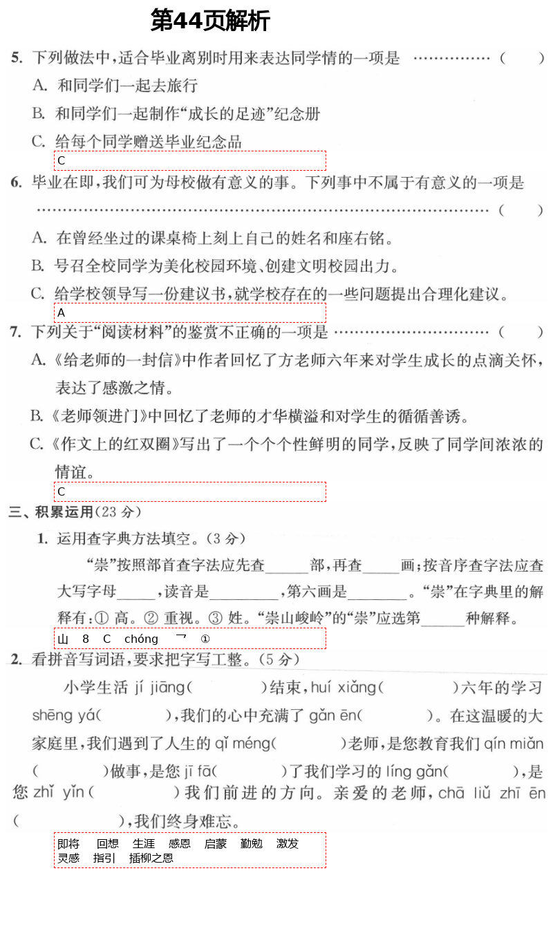 注:目前有些书本章节名称可能整理的还不是很完善,但都是按照顺序排列的,请同学们按照顺序仔细查找。练习册 2021年小学生综合素质标准卷六年级语文下册部编版金丽衢专版 答案主要是用来给同学们做完题方便对答案用的,请勿直接抄袭。