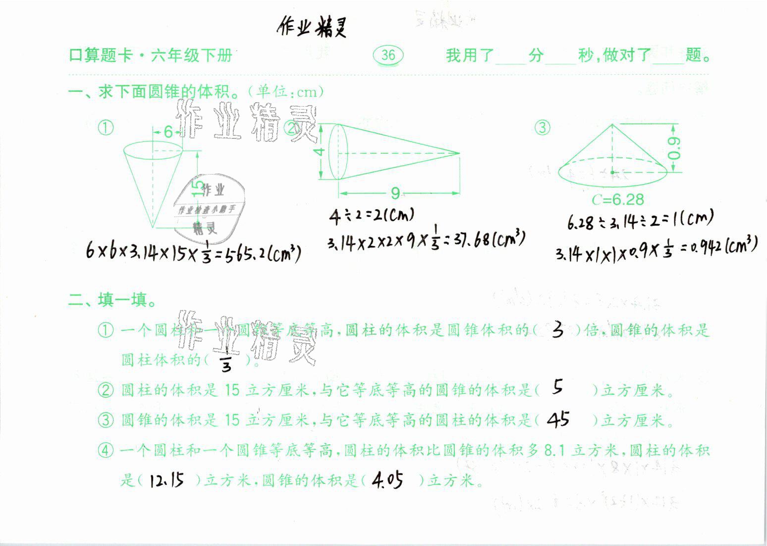 2021年口算题卡六年级数学下册青岛版齐鲁书社