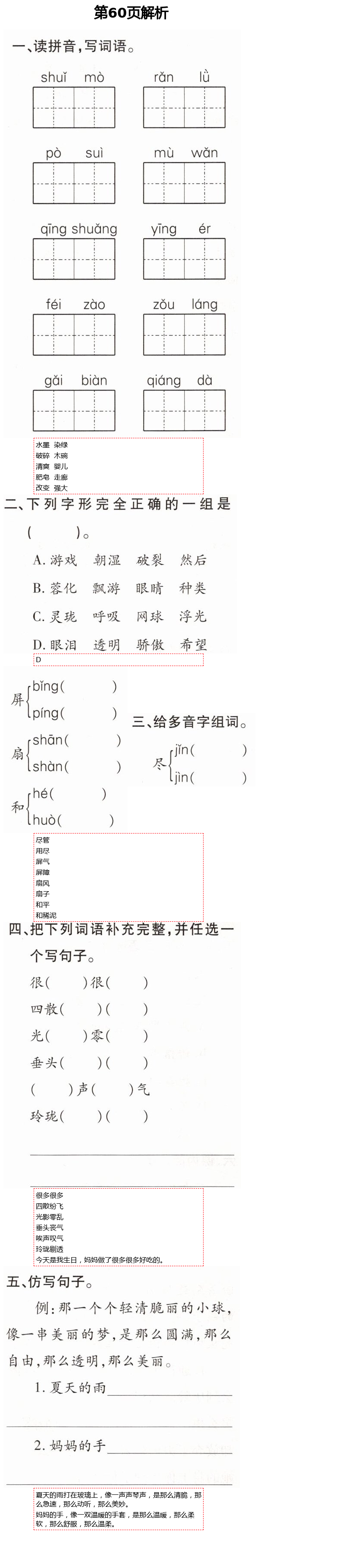 注:目前有些书本章节名称可能整理的还不是很完善,但都是按照顺序排列的,请同学们按照顺序仔细查找。练习册 2021年新课堂同步学习与探究三年级语文下册人教版54制泰安专版 答案主要是用来给同学们做完题方便对答案用的,请勿直接抄袭。