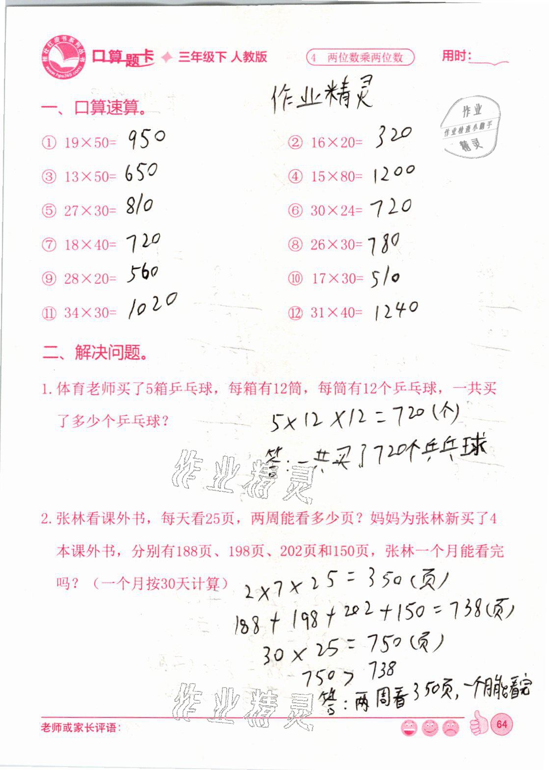 2021年桂状红皮书口算题卡三年级数学下册人教版