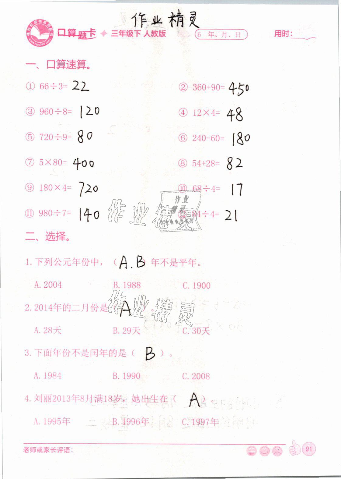 注:目前有些书本章节名称可能整理的还不是很完善,但都是按照顺序排列的,请同学们按照顺序仔细查找。练习册 2021年桂状红皮书口算题卡三年级数学下册人教版 答案主要是用来给同学们做完题方便对答案用的,请勿直接抄袭。