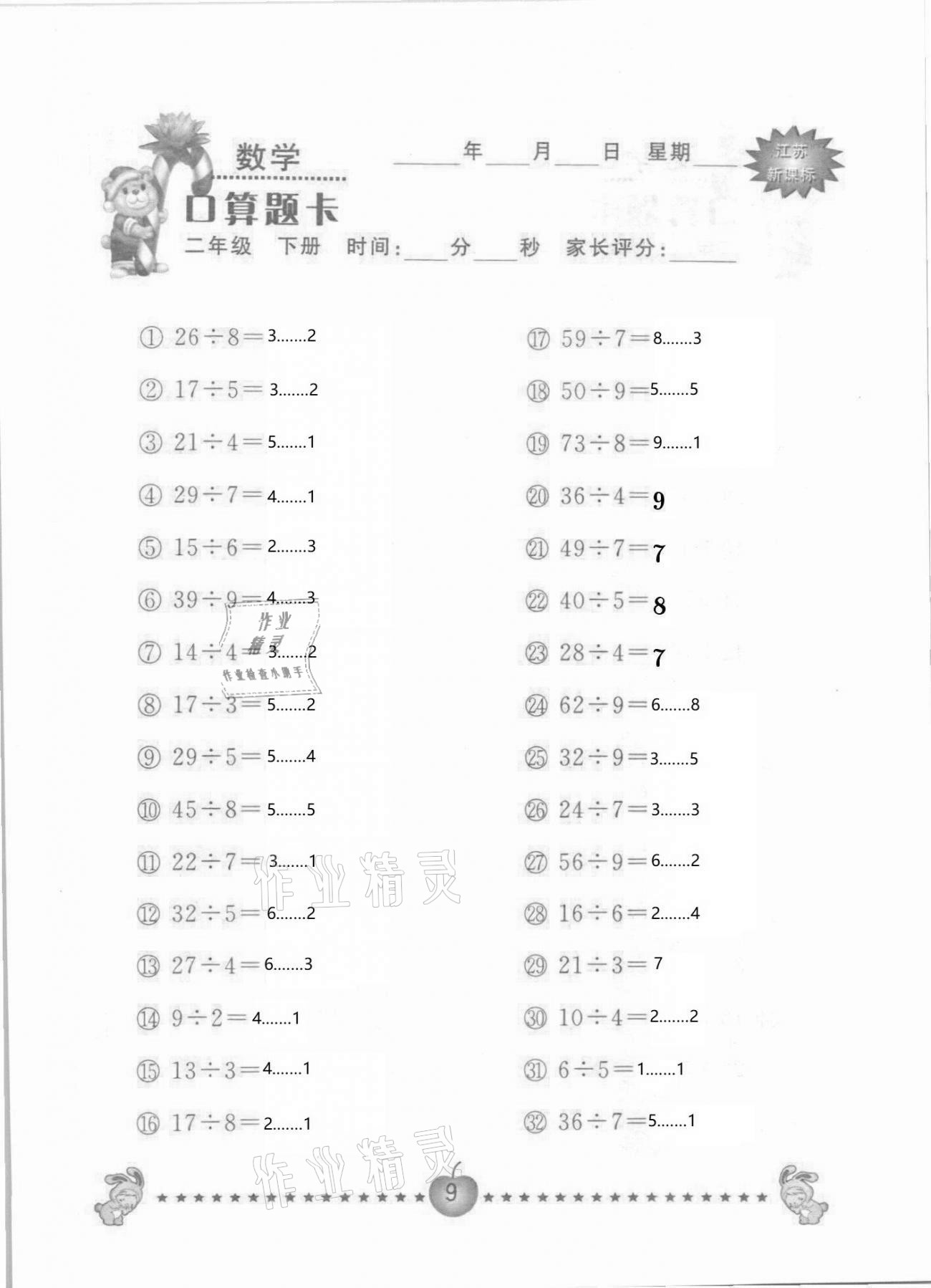 2021年小学数学口算题卡二年级下册苏教版南京大学出版社