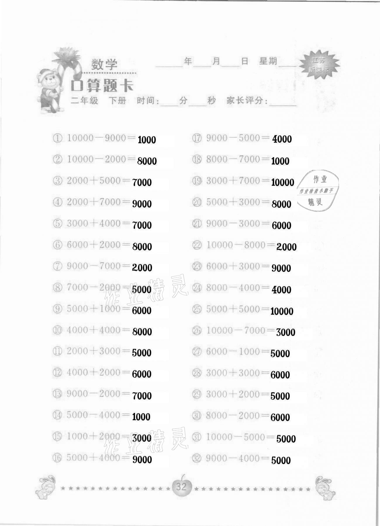 2021年小学数学口算题卡二年级下册苏教版南京大学出版社
