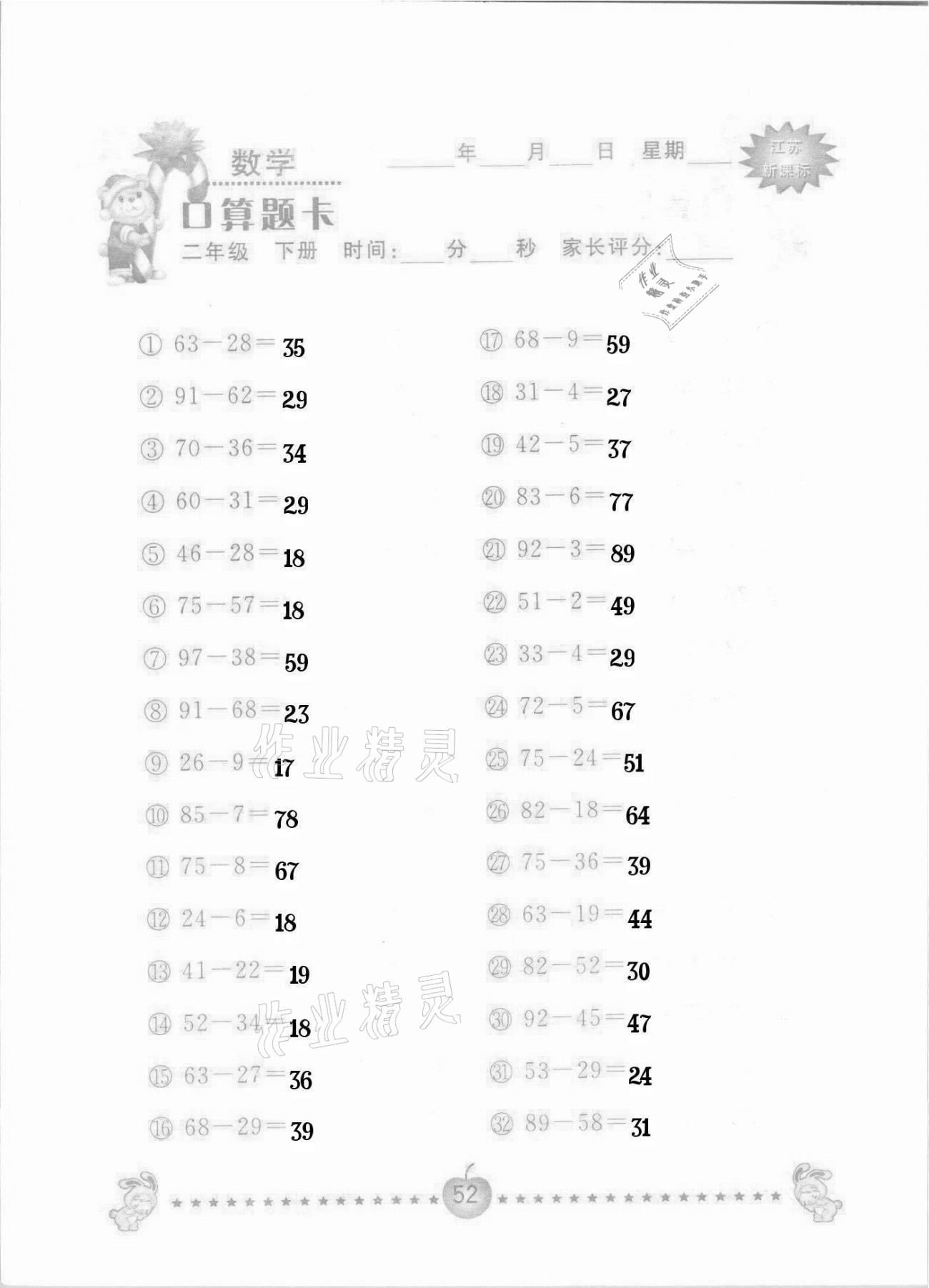 2021年小学数学口算题卡二年级下册苏教版南京大学出版社