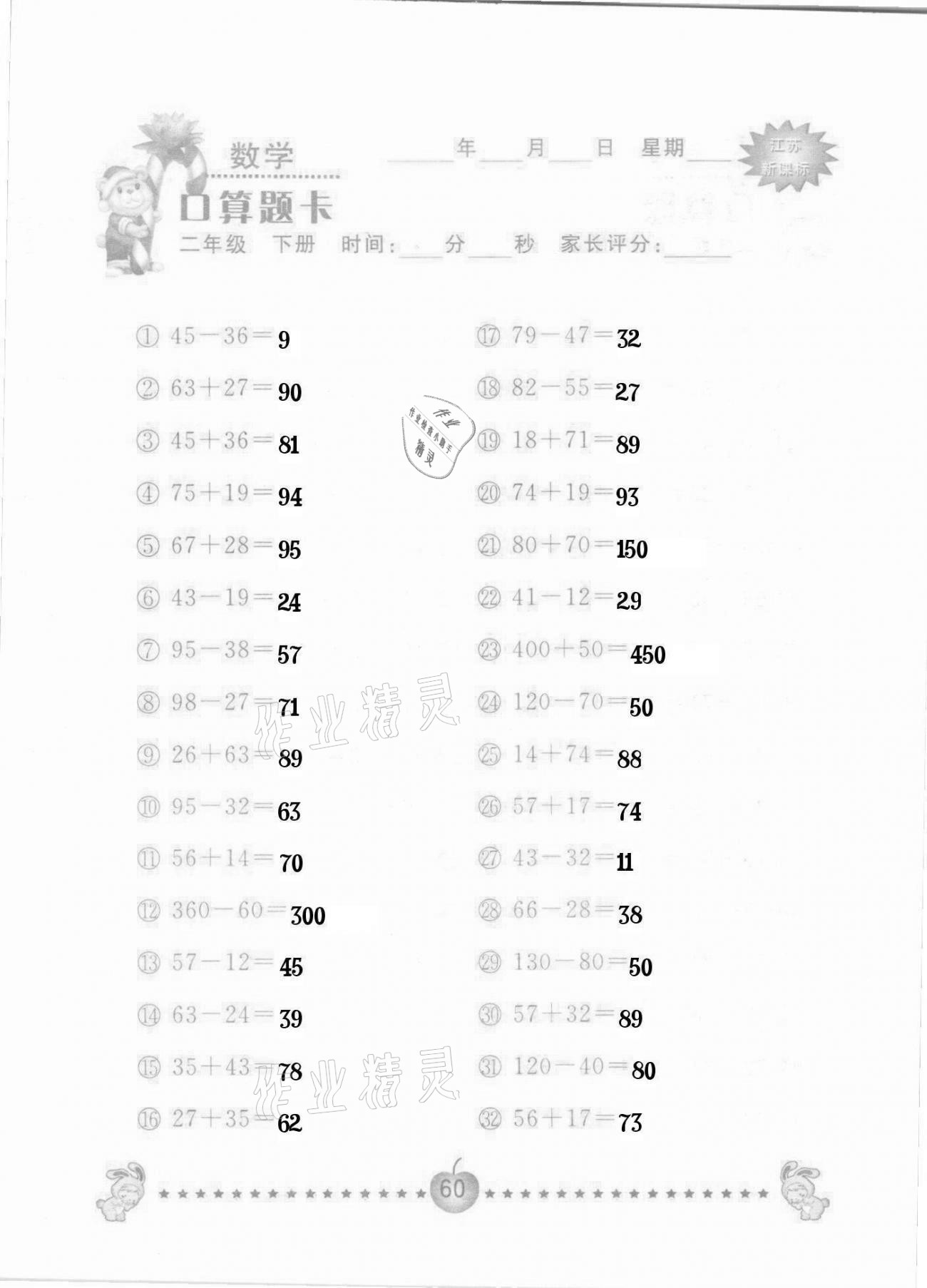 2021年小学数学口算题卡二年级下册苏教版南京大学出版社