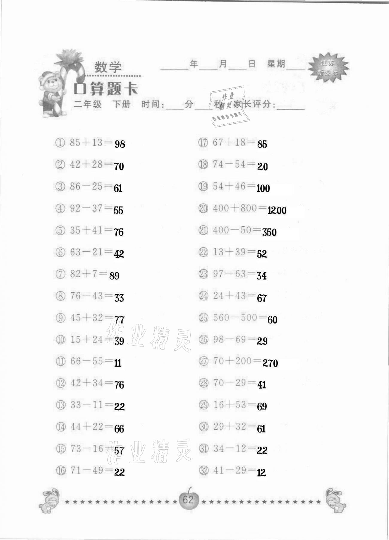 2021年小学数学口算题卡二年级下册苏教版南京大学出版社