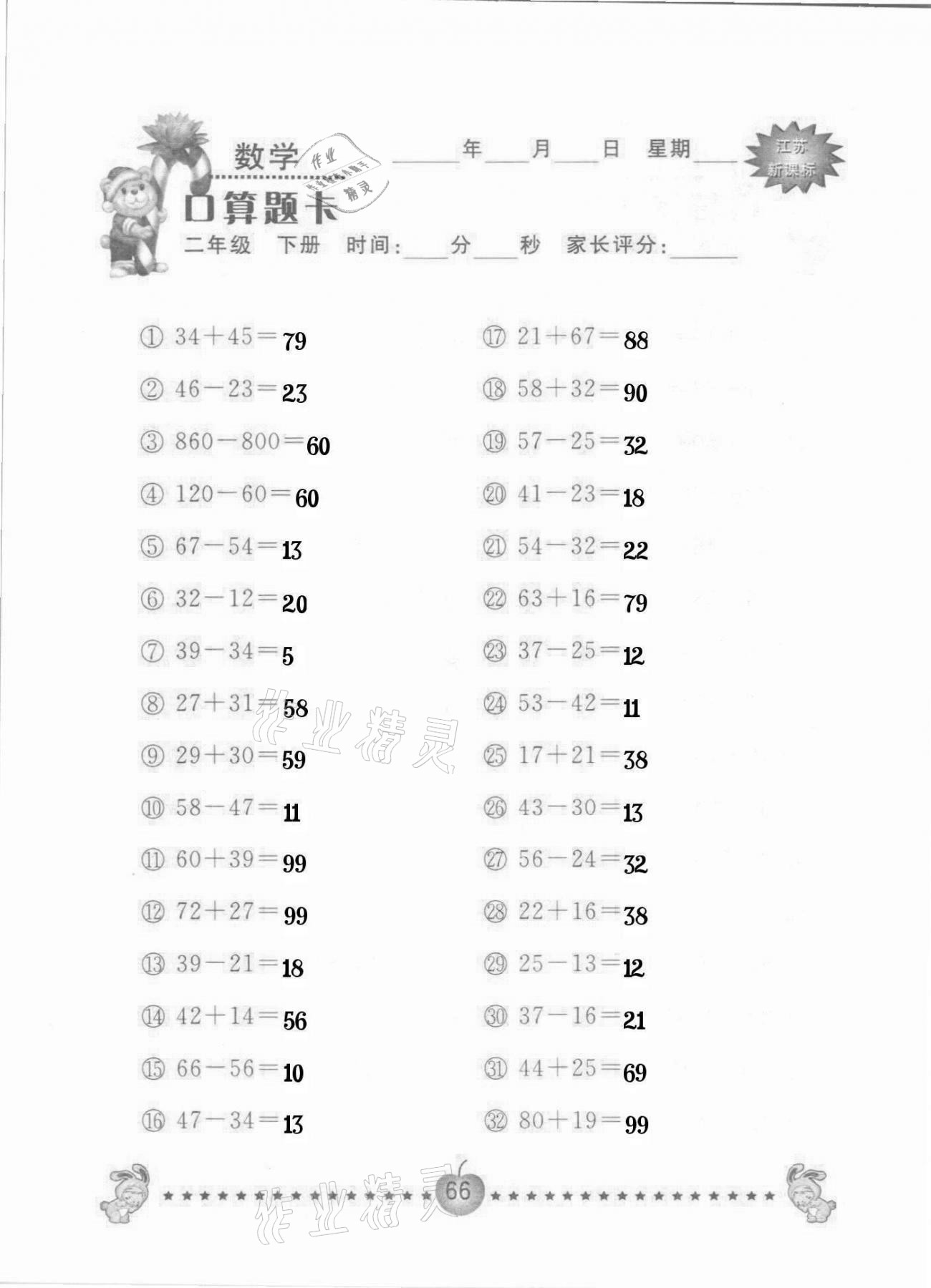 2021年小学数学口算题卡二年级下册苏教版南京大学出版社