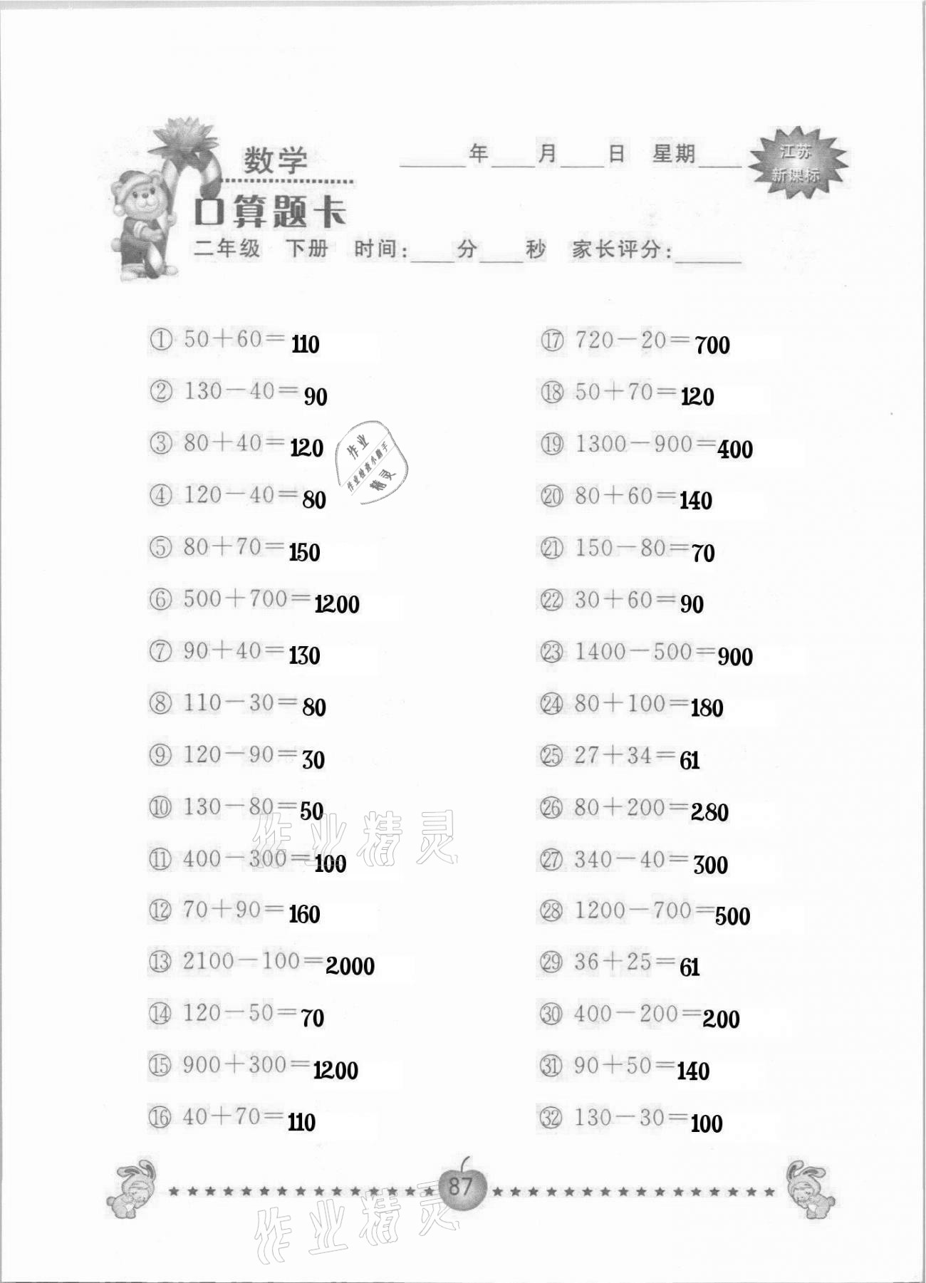 2021年小学数学口算题卡二年级下册苏教版南京大学出版社