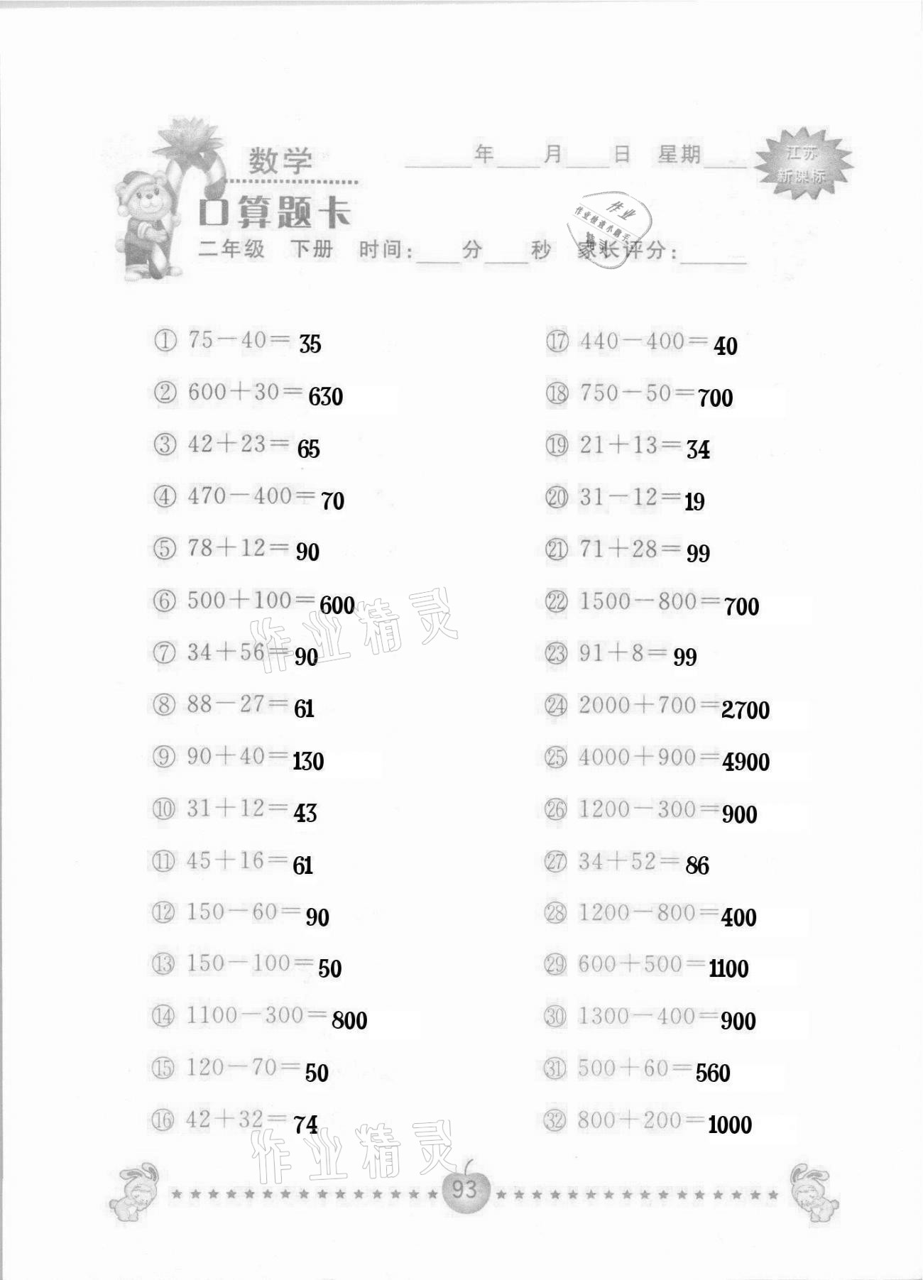 2021年小学数学口算题卡二年级下册苏教版南京大学出版社