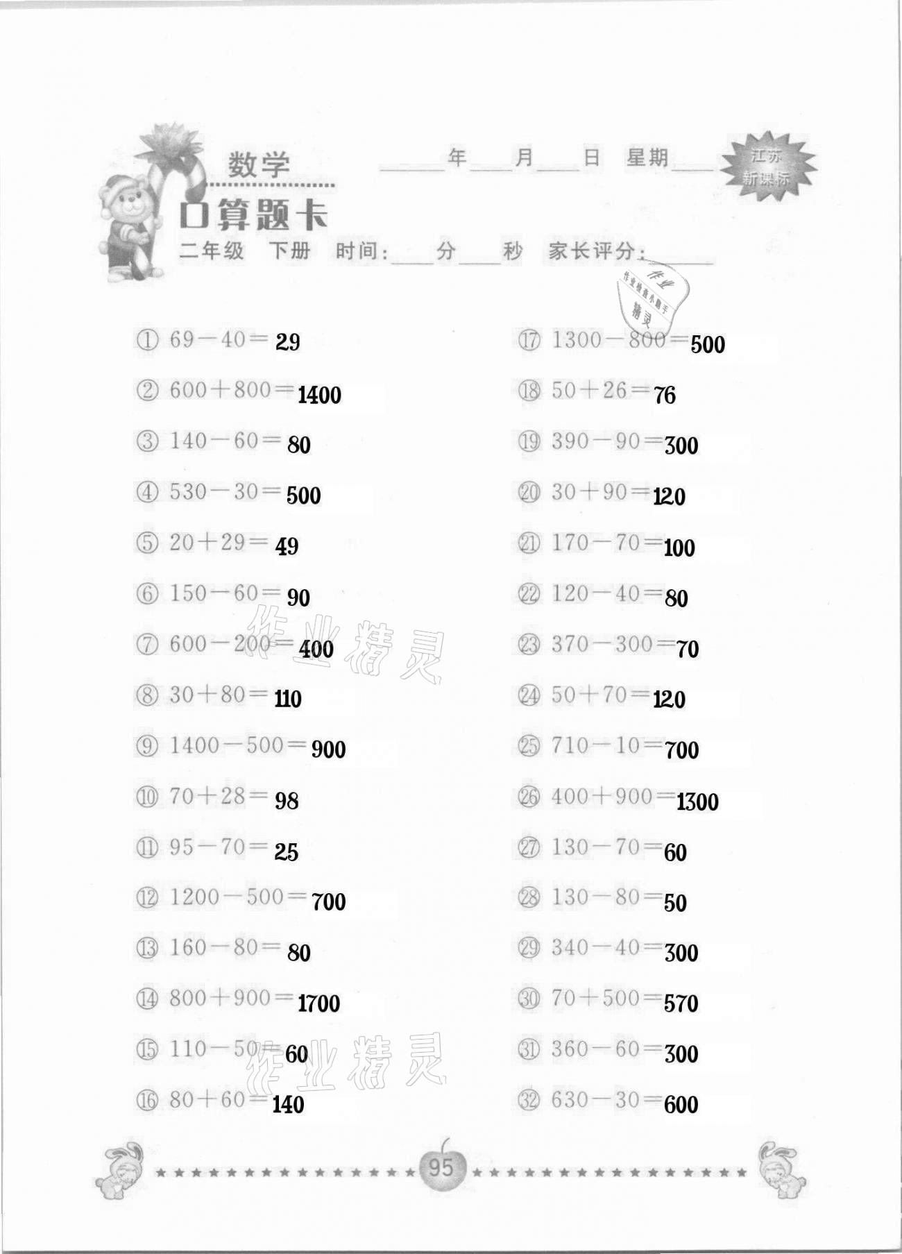 2021年小学数学口算题卡二年级下册苏教版南京大学出版社