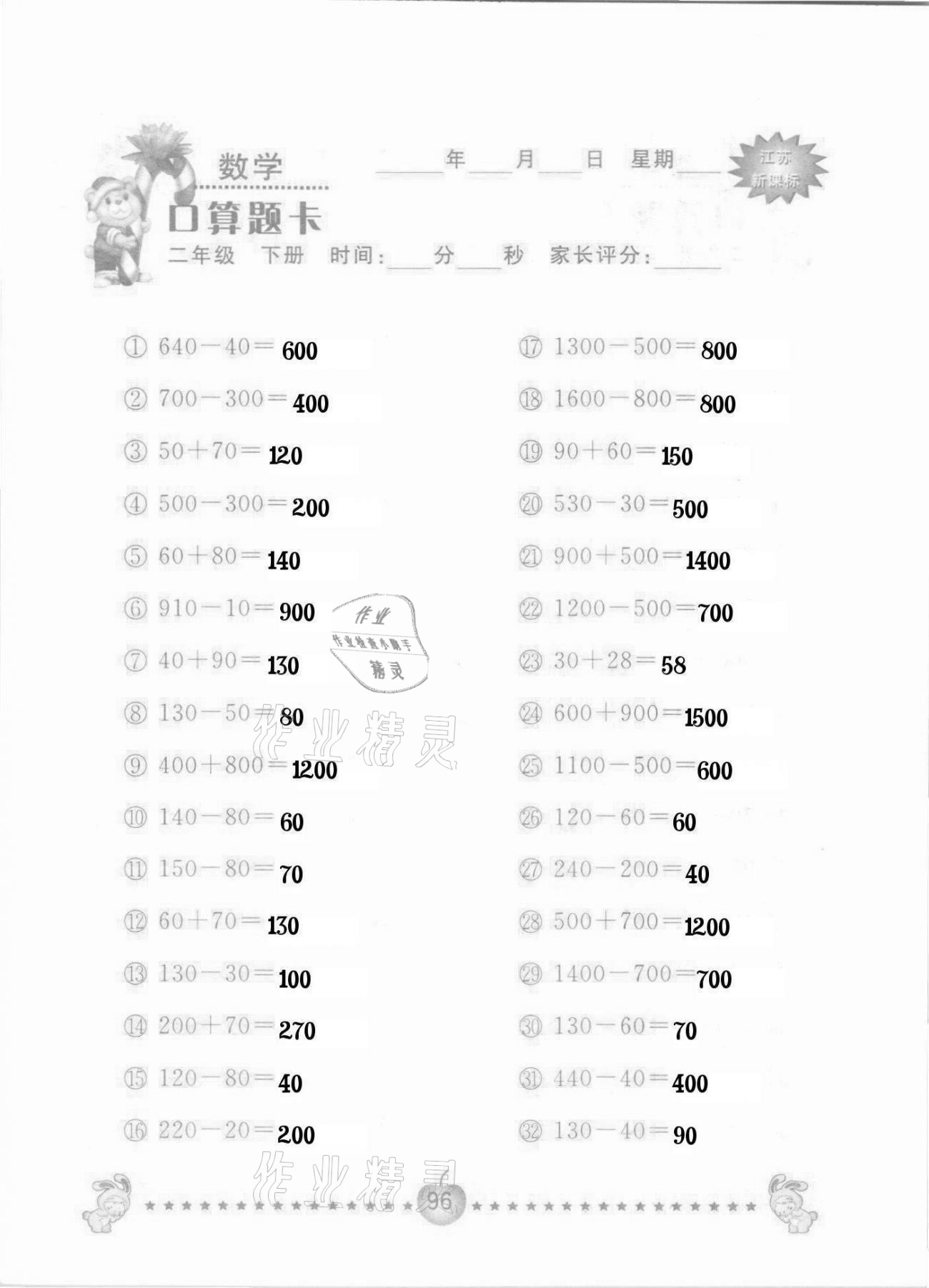 2021年小学数学口算题卡二年级下册苏教版南京大学出版社