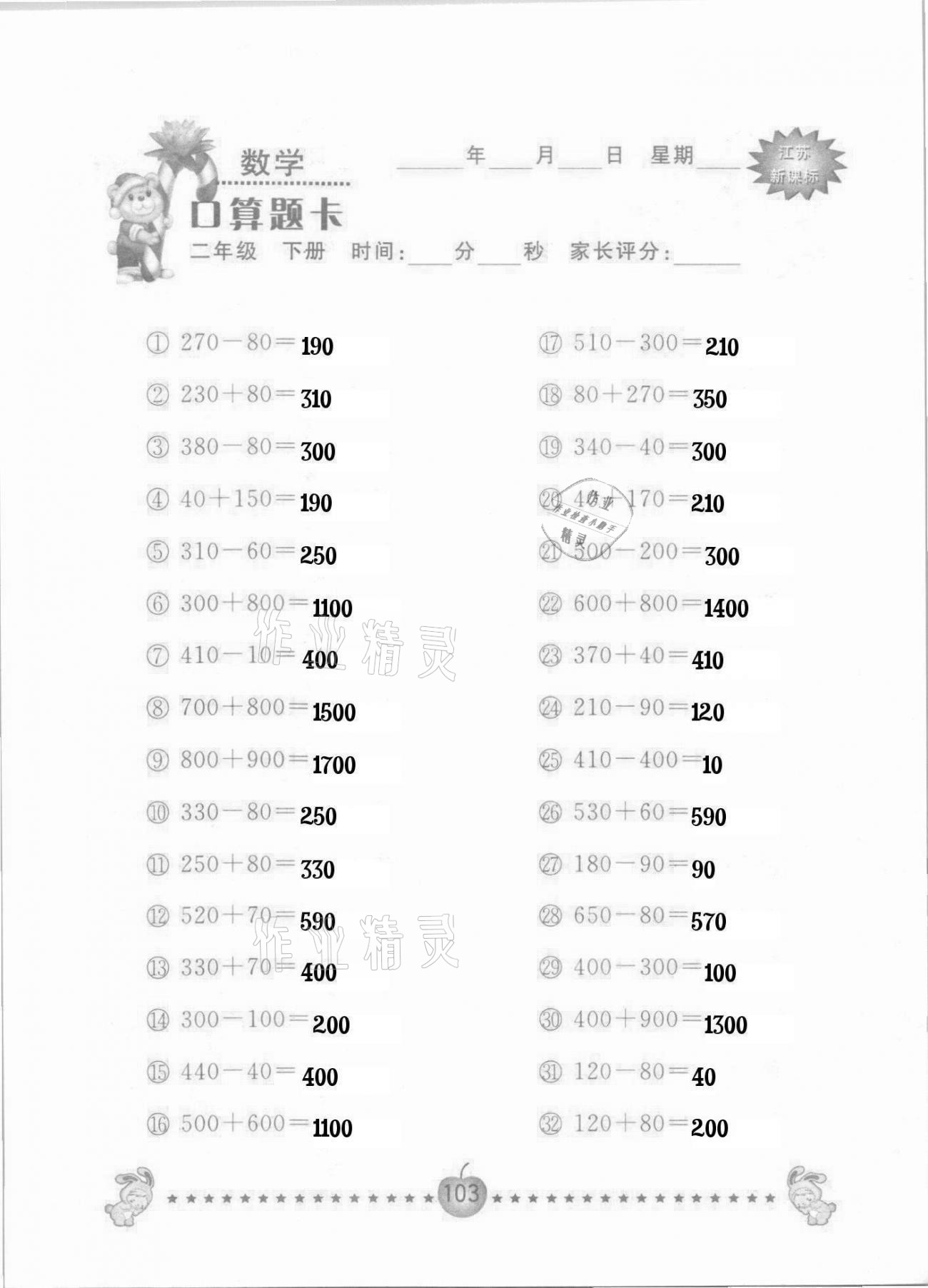 2021年小学数学口算题卡二年级下册苏教版南京大学出版社