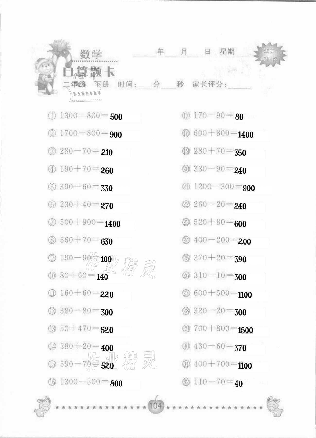 2021年小学数学口算题卡二年级下册苏教版南京大学出版社