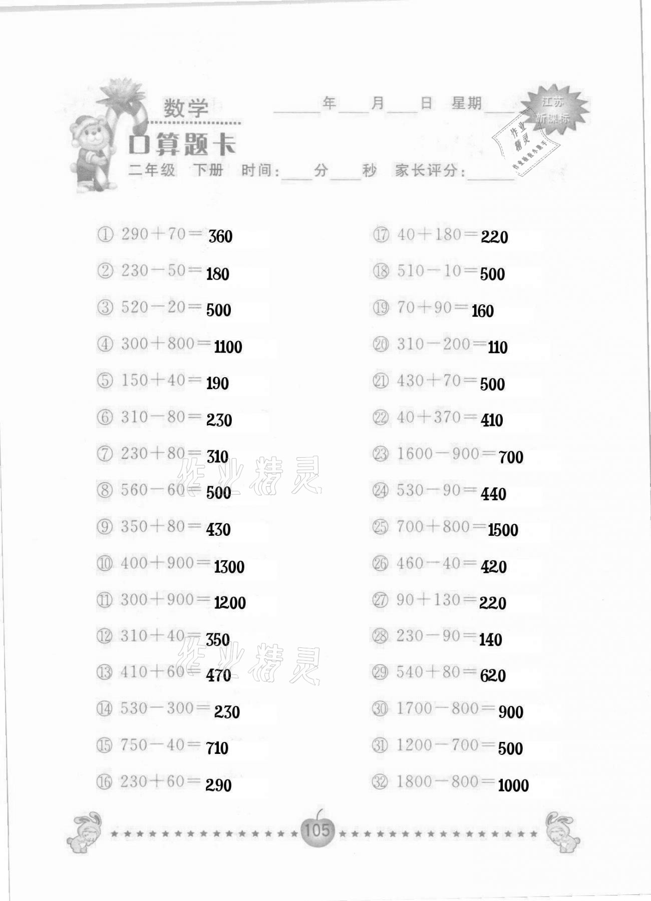 2021年小学数学口算题卡二年级下册苏教版南京大学出版社