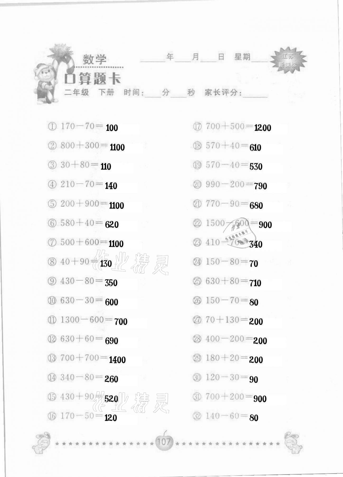 2021年小学数学口算题卡二年级下册苏教版南京大学出版社