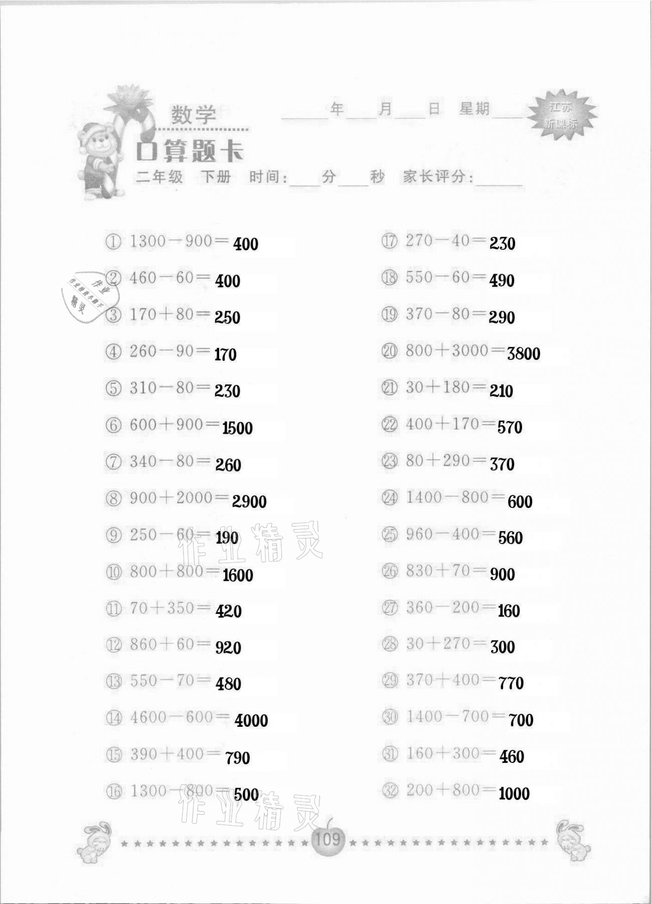 2021年小学数学口算题卡二年级下册苏教版南京大学出版社