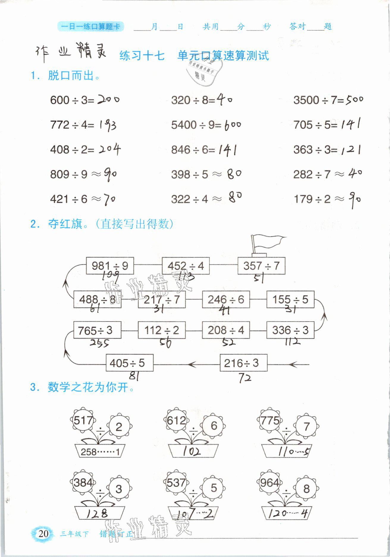 注:目前有些书本章节名称可能整理的还不是很完善,但都是按照顺序排列的,请同学们按照顺序仔细查找。练习册 2021年口算题卡三年级数学下册人教版山东专版四川美术出版社 答案主要是用来给同学们做完题方便对答案用的,请勿直接抄袭。