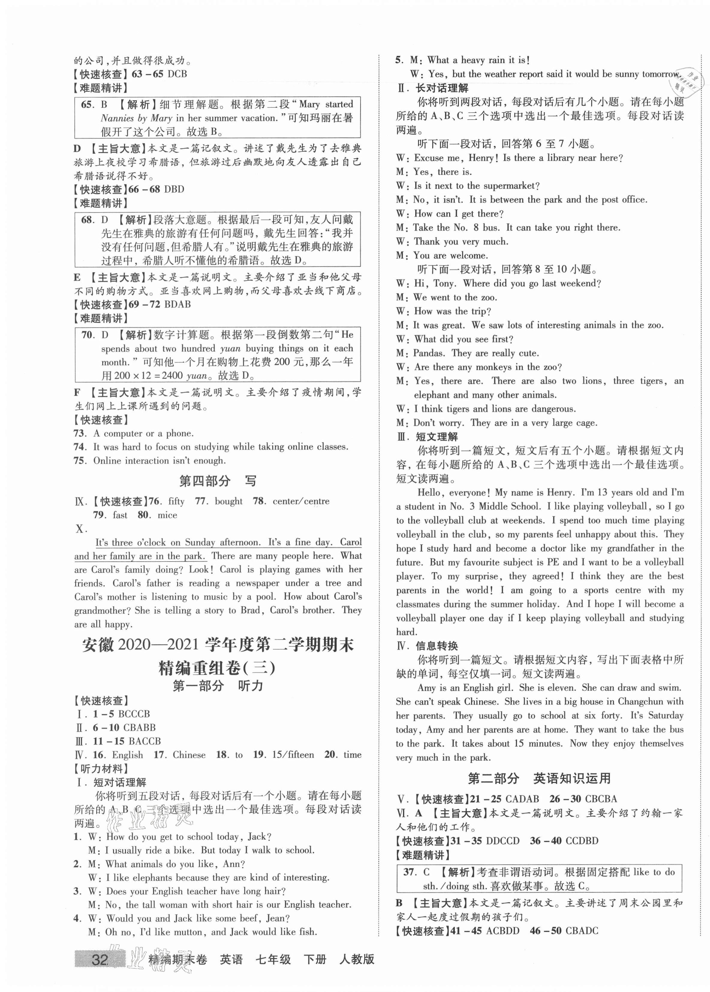 注:目前有些书本章节名称可能整理的还不是很完善,但都是按照顺序排列的,请同学们按照顺序仔细查找。练习册 2021年精编期末卷七年级英语下册人教版安徽专版 答案主要是用来给同学们做完题方便对答案用的,请勿直接抄袭。