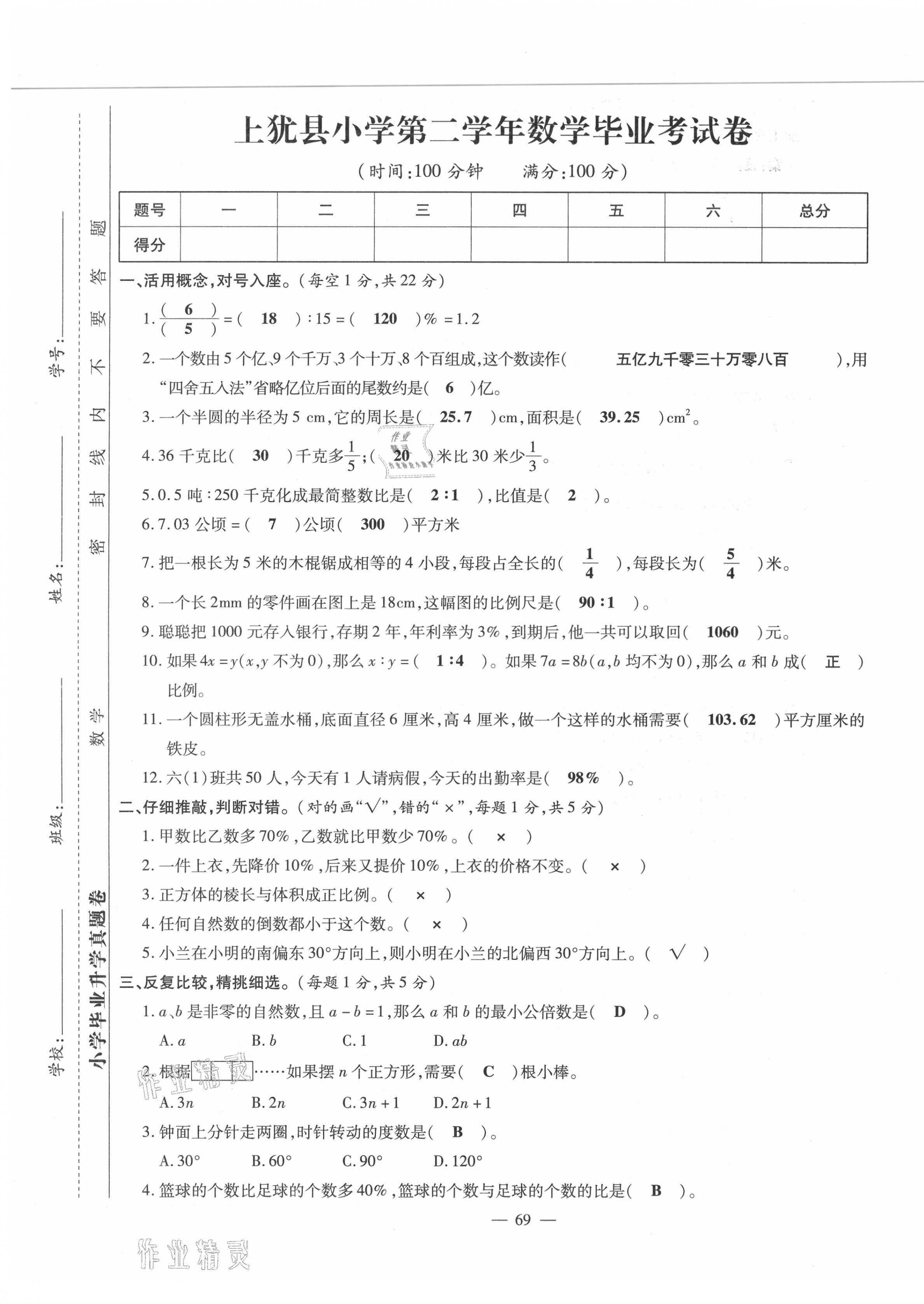 2021年小升初试题汇编数学江西专版