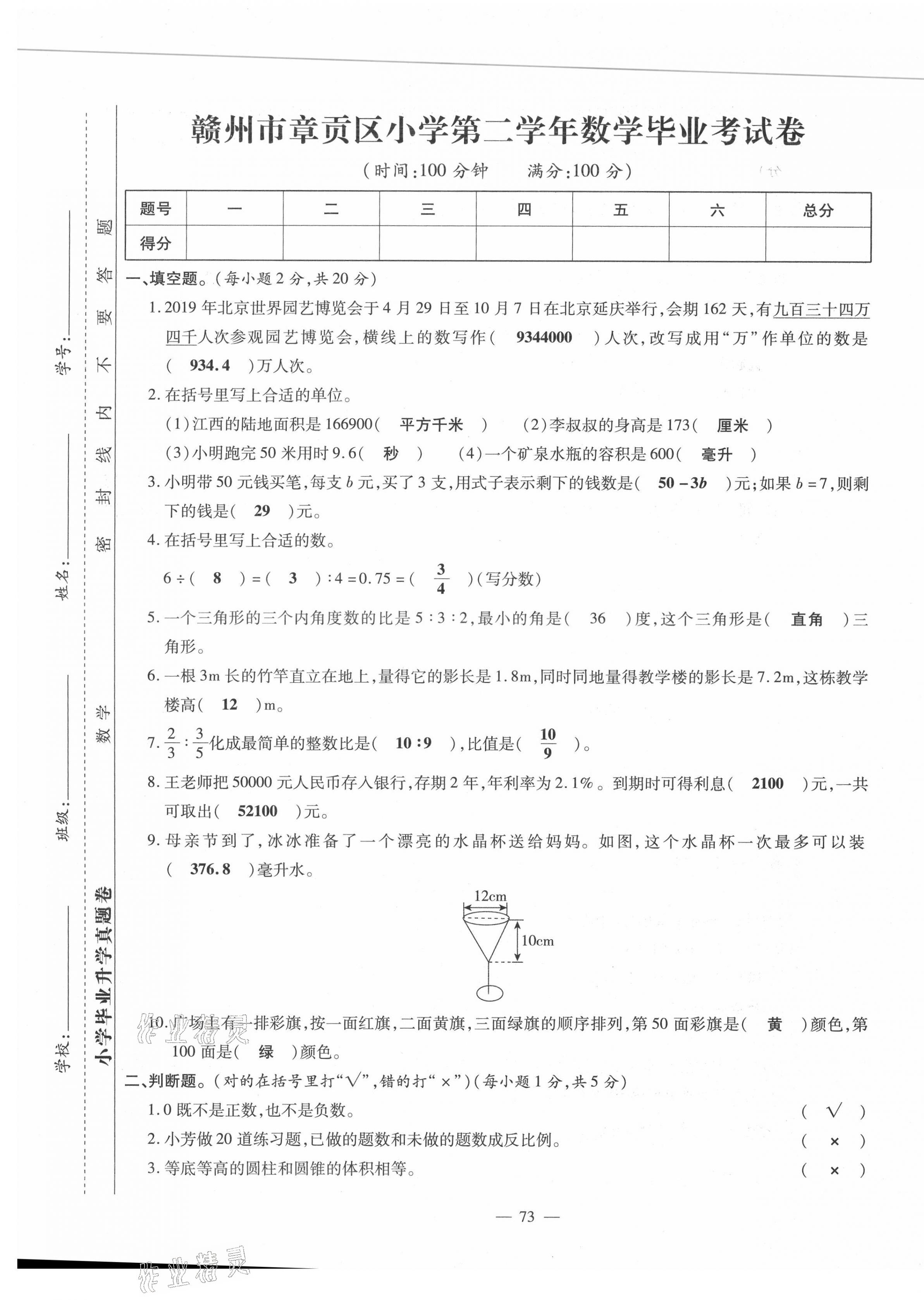 2021年小升初试题汇编数学江西专版
