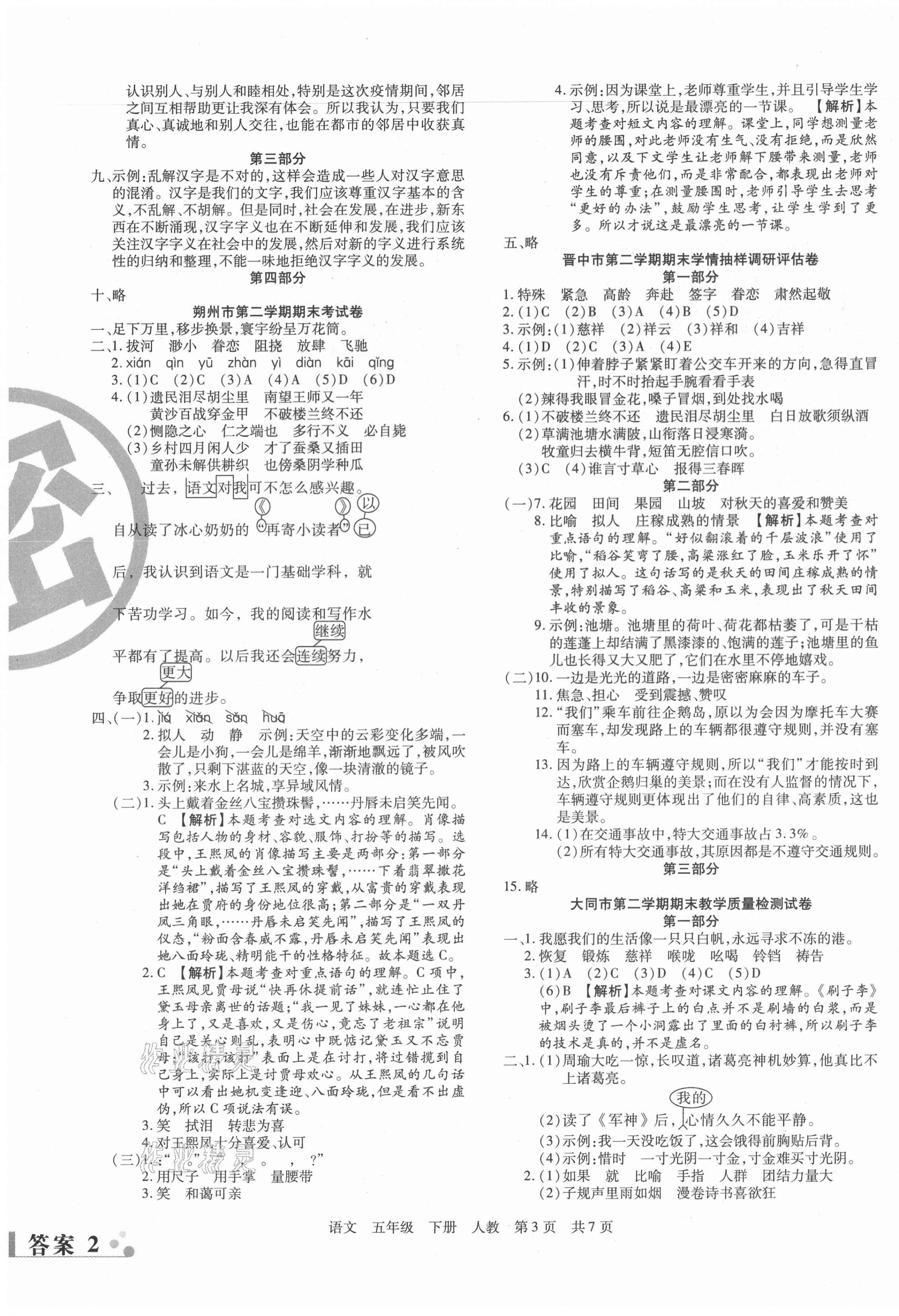 注:目前有些书本章节名称可能整理的还不是很完善,但都是按照顺序排列的,请同学们按照顺序仔细查找。练习册 2021年学业测评期末真题必刷卷五年级语文下册人教版山西专版 答案主要是用来给同学们做完题方便对答案用的,请勿直接抄袭。