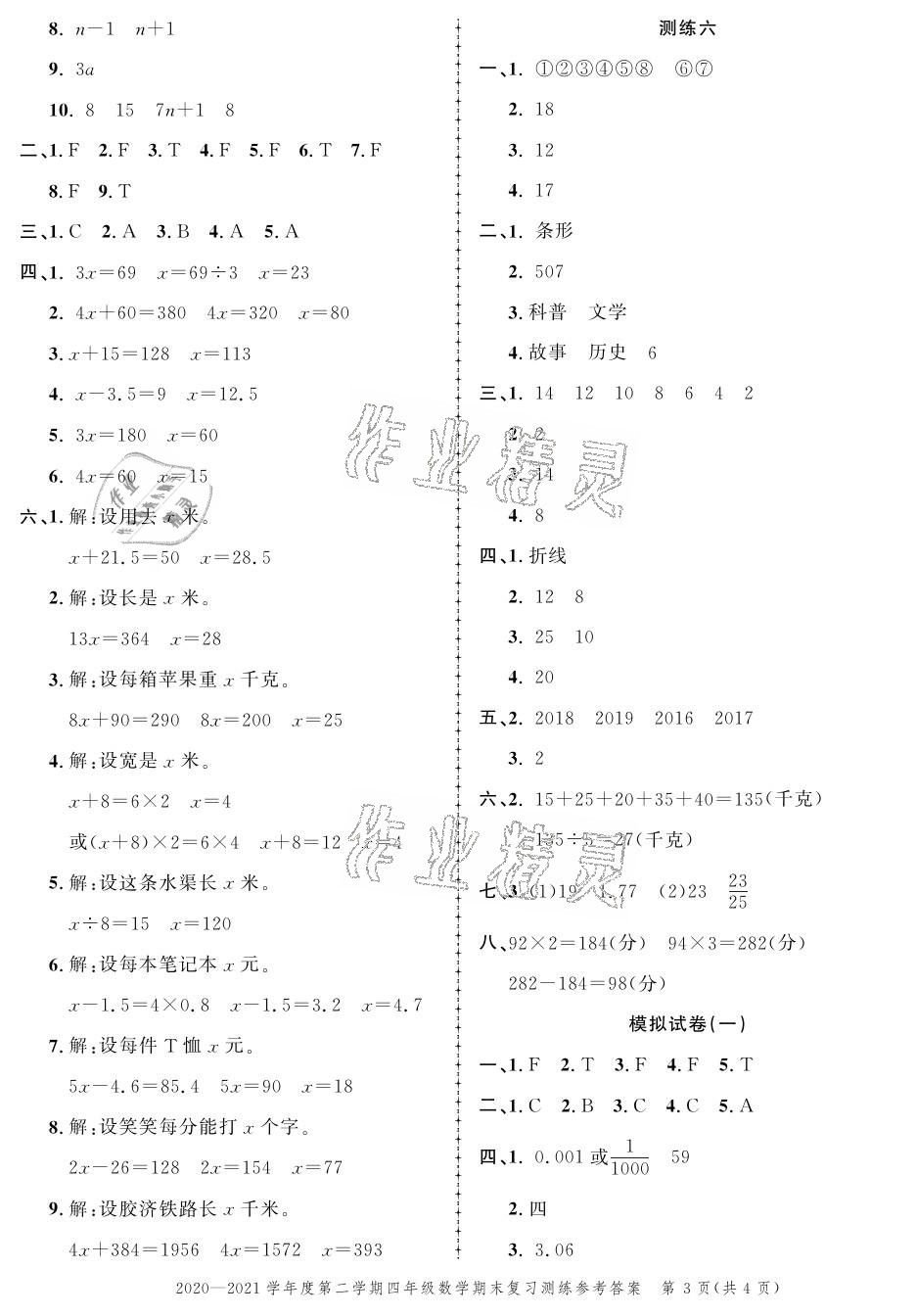 注:目前有些书本章节名称可能整理的还不是很完善,但都是按照顺序排列的,请同学们按照顺序仔细查找。练习册 2021年创新作业同步练习期末复习试卷四年级数学下册北师大版 答案主要是用来给同学们做完题方便对答案用的,请勿直接抄袭。