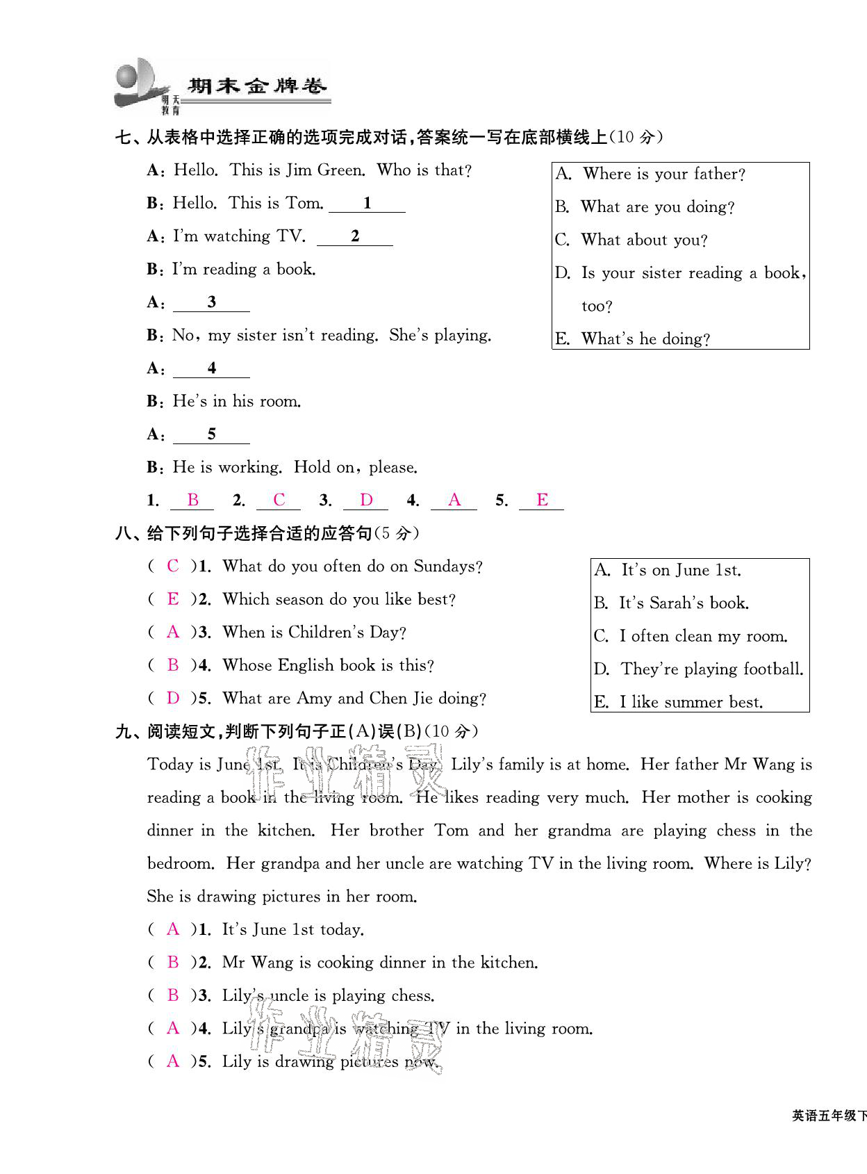 注:目前有些书本章节名称可能整理的还不是很完善,但都是按照顺序排列的,请同学们按照顺序仔细查找。练习册 2021年期末金牌卷五年级英语下册人教PEP版宁波专版 答案主要是用来给同学们做完题方便对答案用的,请勿直接抄袭。