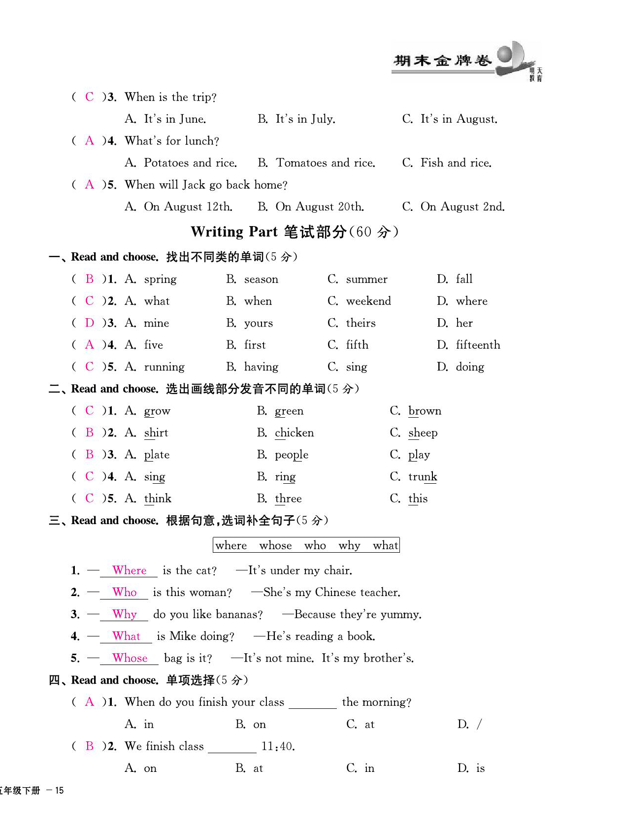 注:目前有些书本章节名称可能整理的还不是很完善,但都是按照顺序排列的,请同学们按照顺序仔细查找。练习册 2021年期末金牌卷五年级英语下册人教PEP版宁波专版 答案主要是用来给同学们做完题方便对答案用的,请勿直接抄袭。
