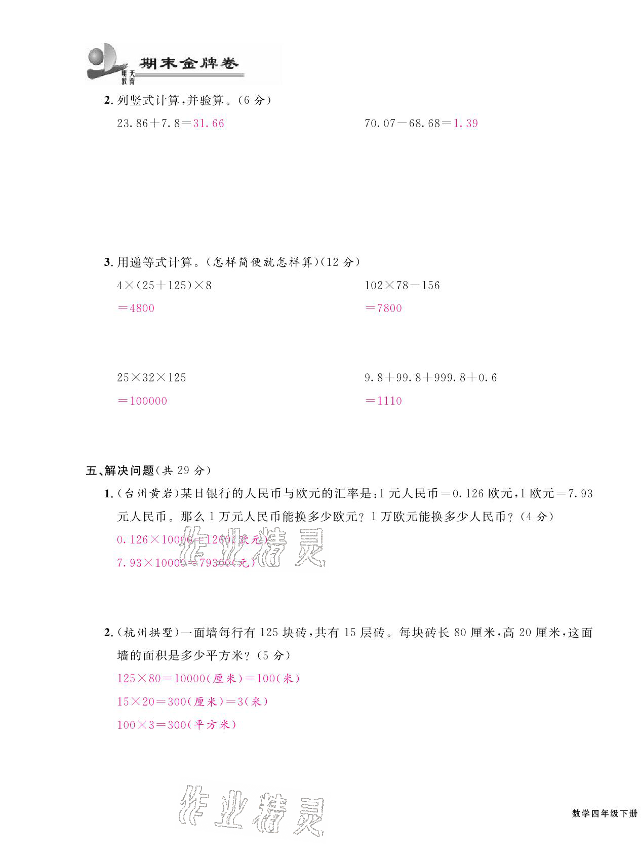 注:目前有些书本章节名称可能整理的还不是很完善,但都是按照顺序排列的,请同学们按照顺序仔细查找。练习册 2021年期末金牌卷四年级数学下册人教版宁波专版 答案主要是用来给同学们做完题方便对答案用的,请勿直接抄袭。