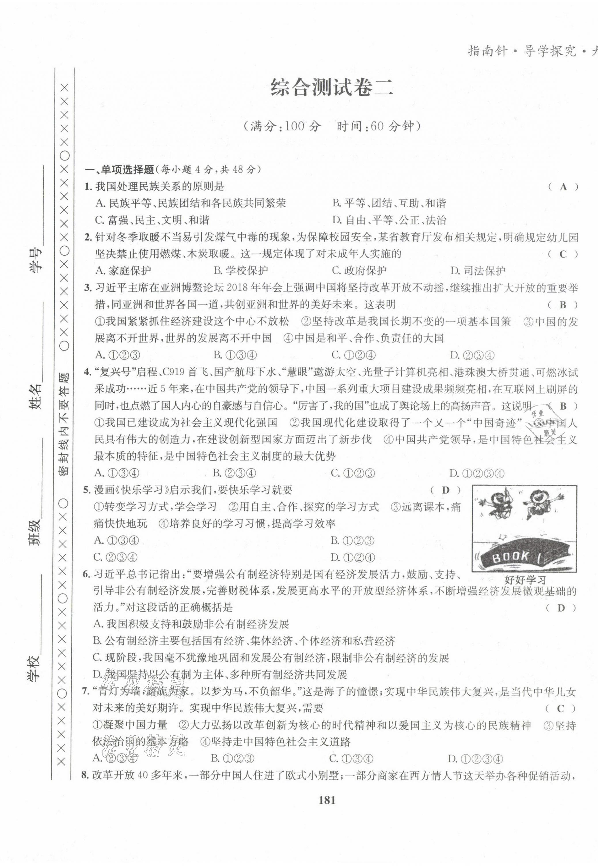 注:目前有些书本章节名称可能整理的还不是很完善,但都是按照顺序排列的,请同学们按照顺序仔细查找。练习册 2022版指南针导学探究九年级道德与法治全一册人教版 答案主要是用来给同学们做完题方便对答案用的,请勿直接抄袭。