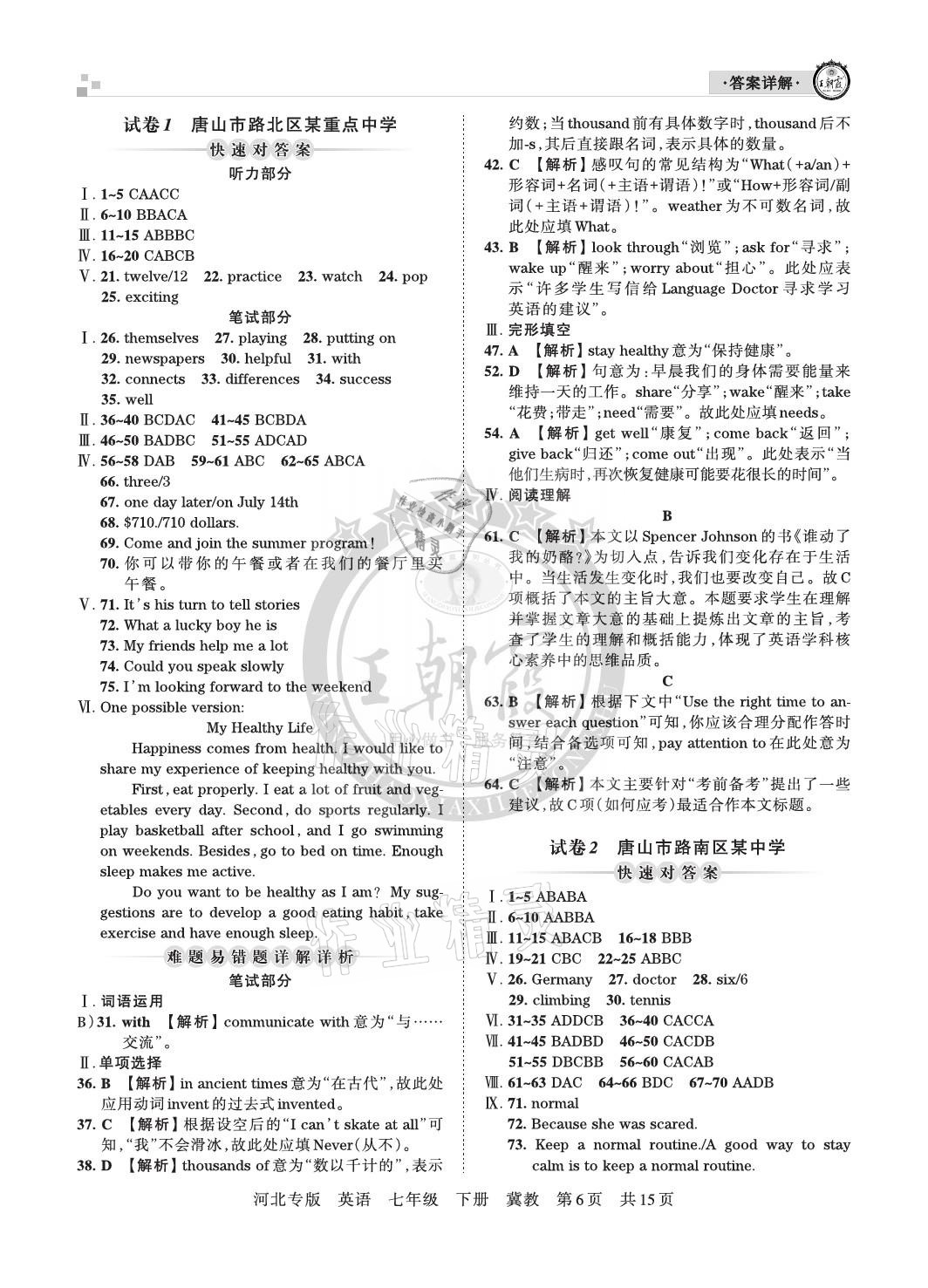 注:目前有些书本章节名称可能整理的还不是很完善,但都是按照顺序排列的,请同学们按照顺序仔细查找。练习册 2021年王朝霞各地期末试卷精选七年级英语下册冀教版河北专版 答案主要是用来给同学们做完题方便对答案用的,请勿直接抄袭。