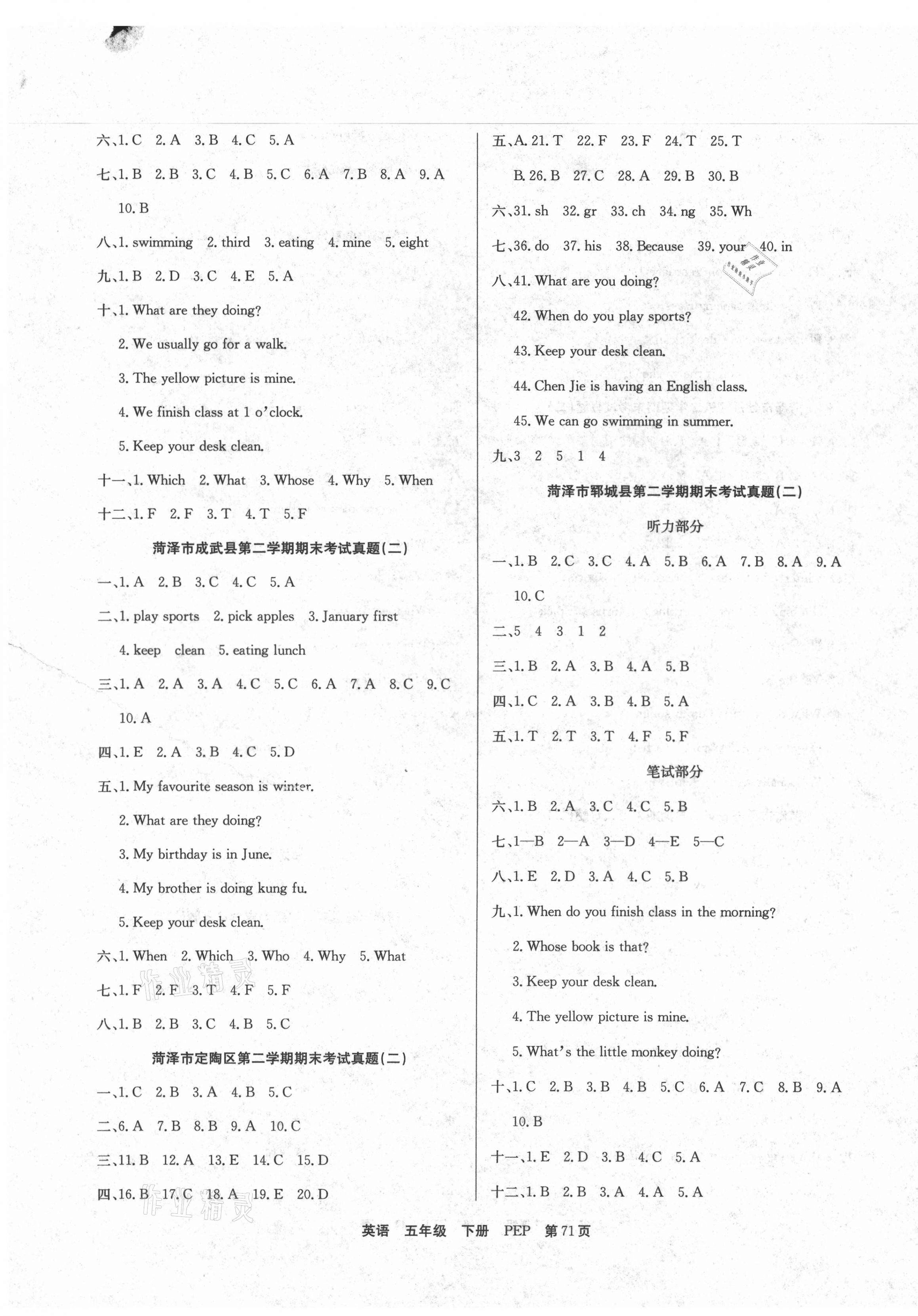 注:目前有些书本章节名称可能整理的还不是很完善,但都是按照顺序排列的,请同学们按照顺序仔细查找。练习册 2021年菏泽真题汇编五年级英语下册人教PEP版 答案主要是用来给同学们做完题方便对答案用的,请勿直接抄袭。