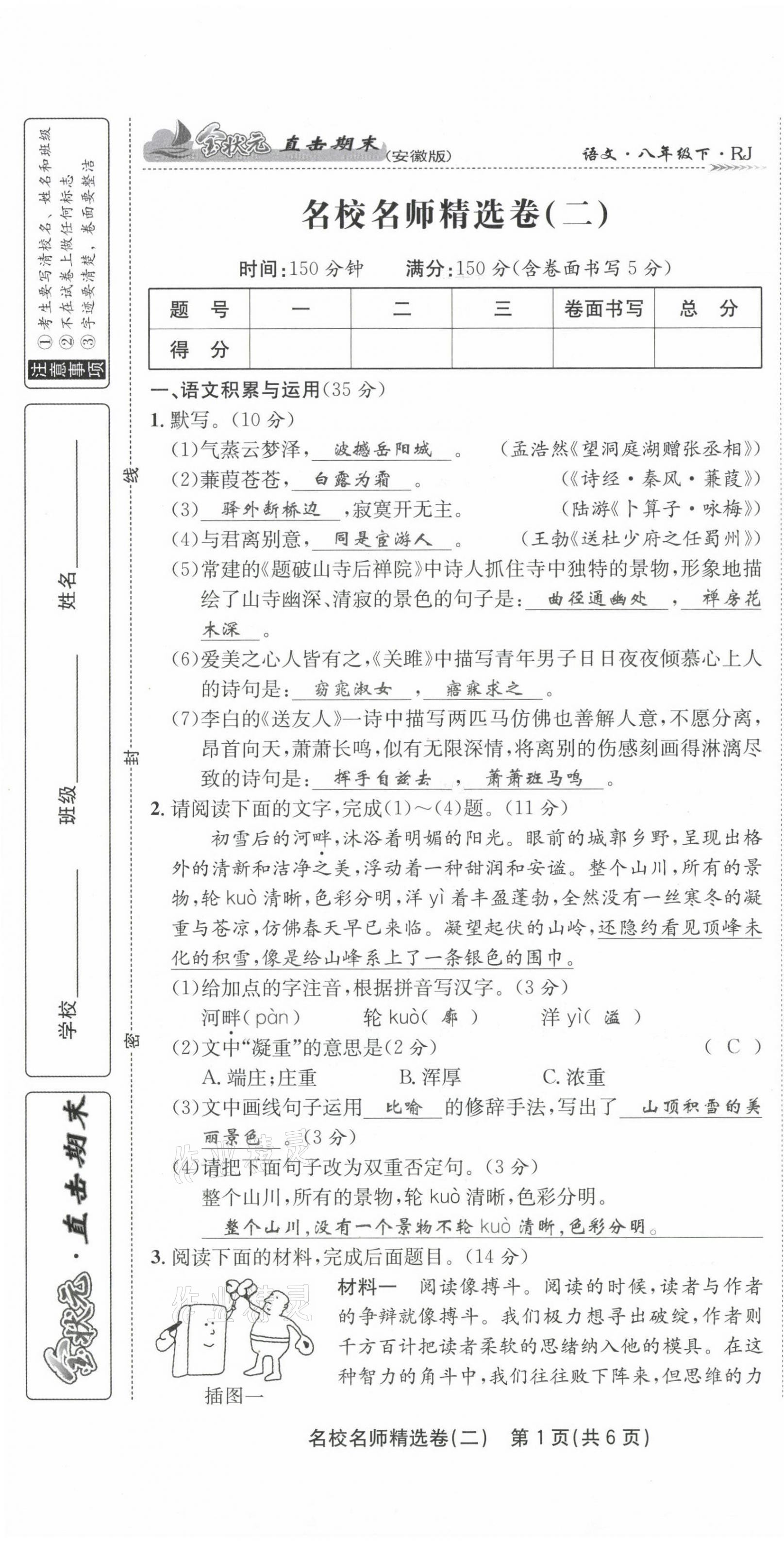 注:目前有些书本章节名称可能整理的还不是很完善,但都是按照顺序排列的,请同学们按照顺序仔细查找。练习册 2021年金状元直击期末八年级语文下册人教版 答案主要是用来给同学们做完题方便对答案用的,请勿直接抄袭。