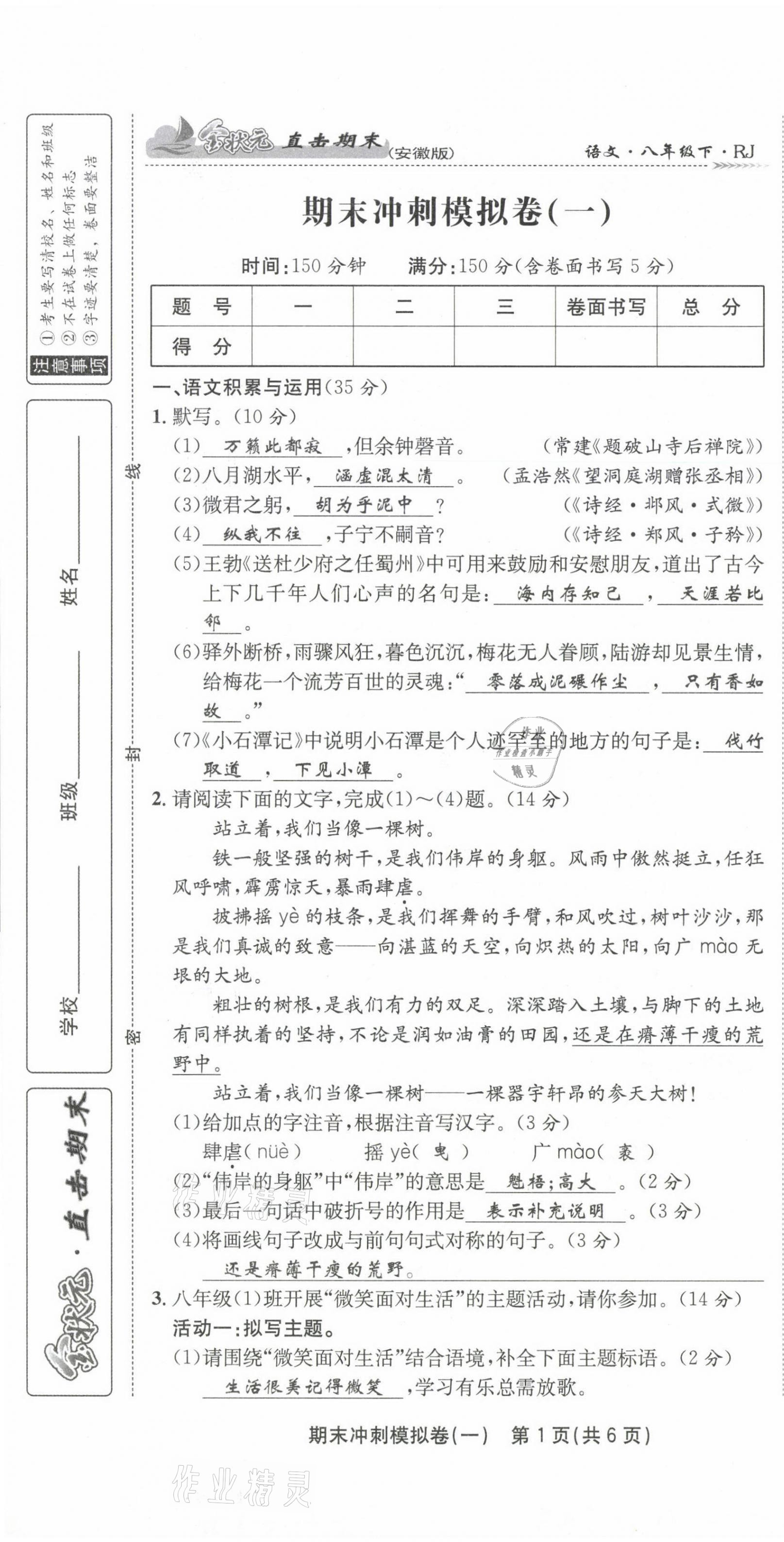 注:目前有些书本章节名称可能整理的还不是很完善,但都是按照顺序排列的,请同学们按照顺序仔细查找。练习册 2021年金状元直击期末八年级语文下册人教版 答案主要是用来给同学们做完题方便对答案用的,请勿直接抄袭。