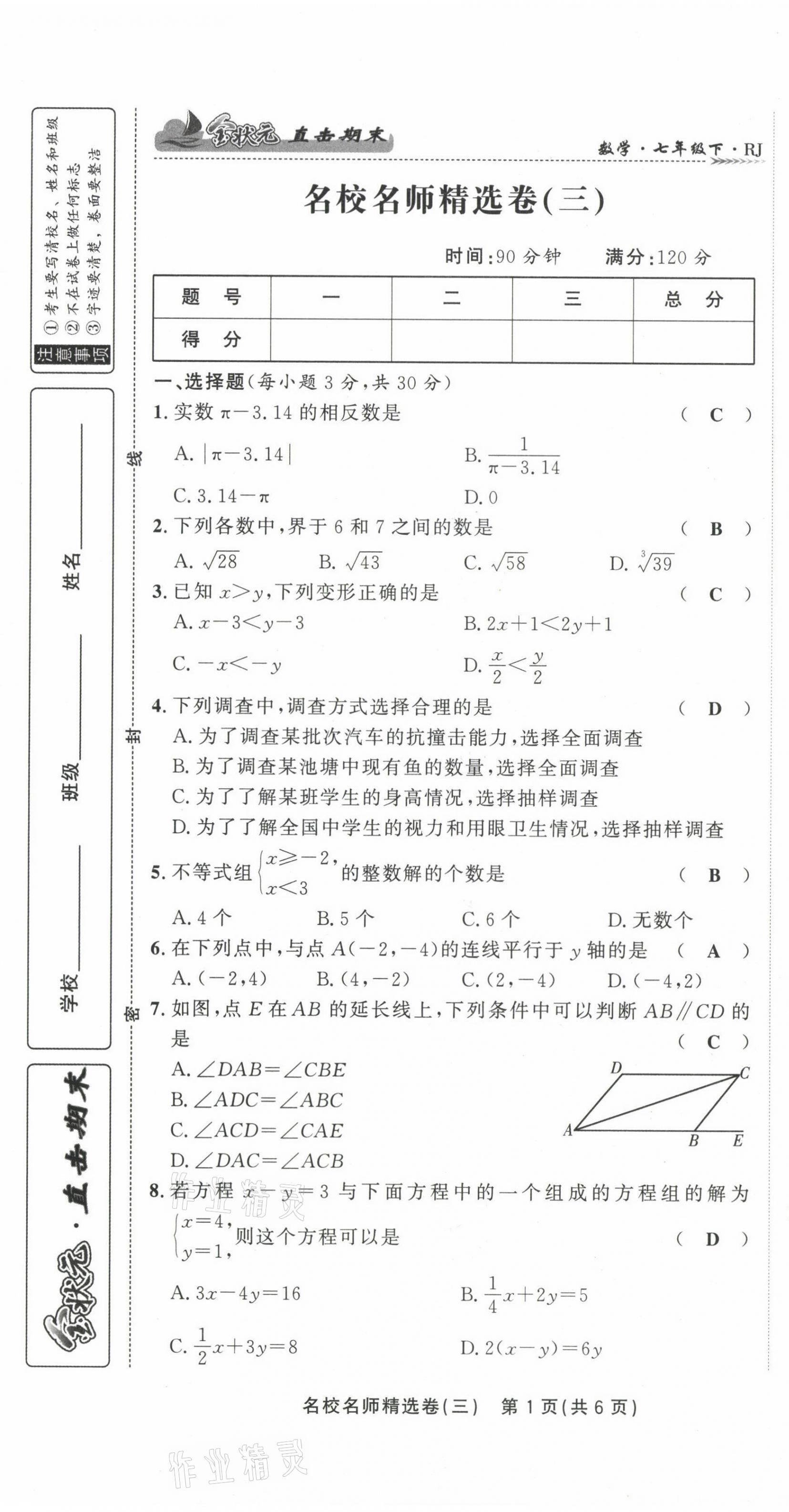 注:目前有些书本章节名称可能整理的还不是很完善,但都是按照顺序排列的,请同学们按照顺序仔细查找。练习册 2021年金状元直击期末七年级数学下册人教版 答案主要是用来给同学们做完题方便对答案用的,请勿直接抄袭。