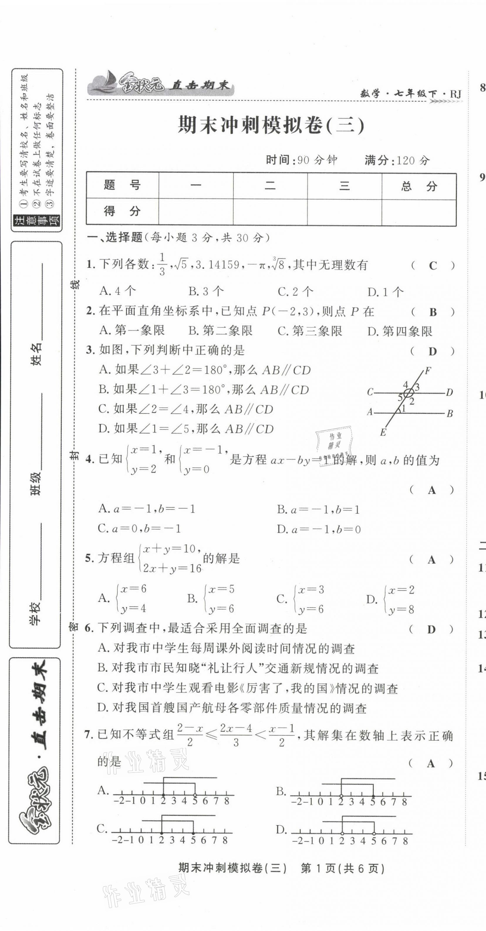 2021年金状元直击期末七年级数学下册人教版
